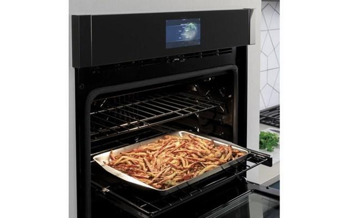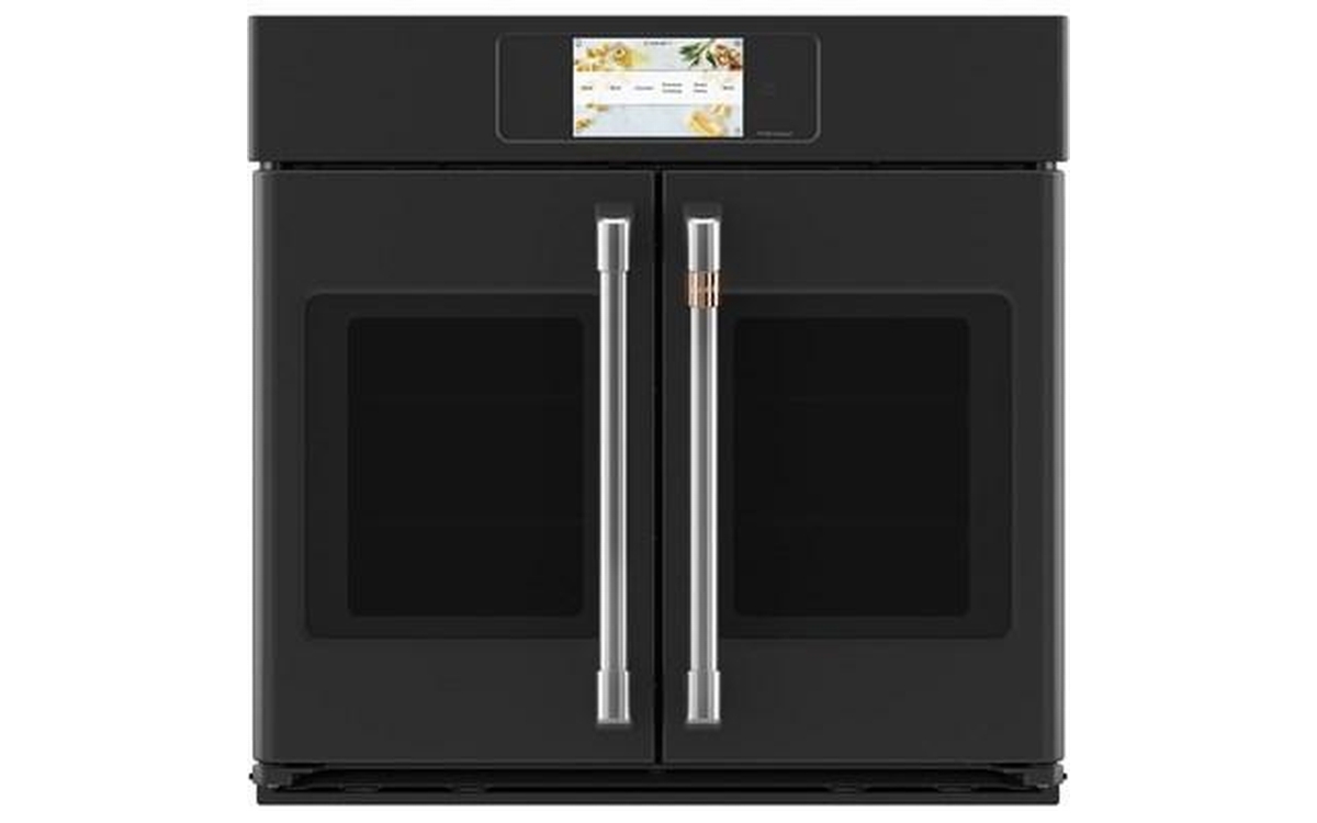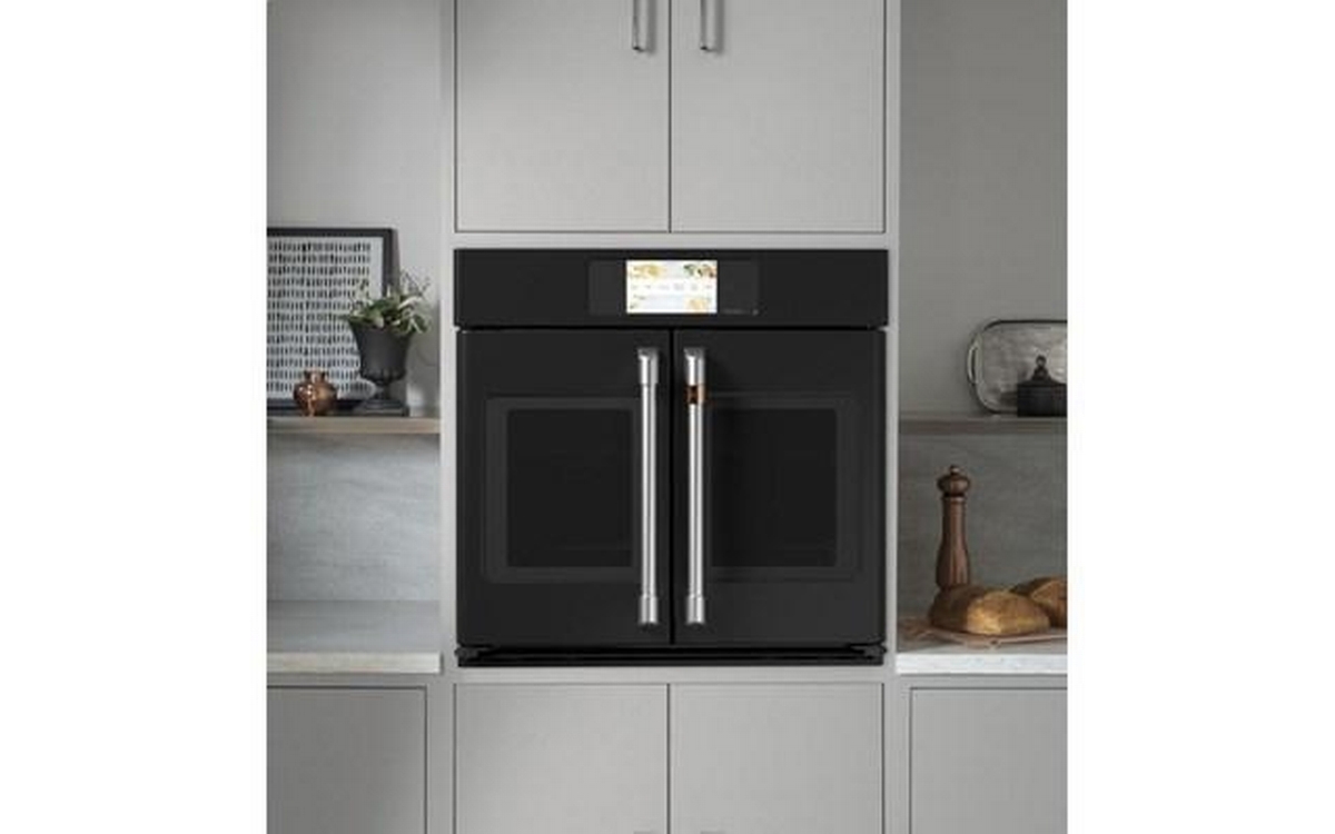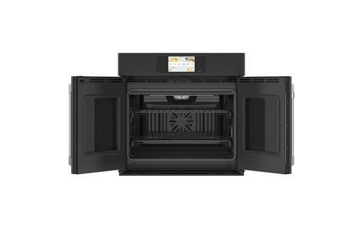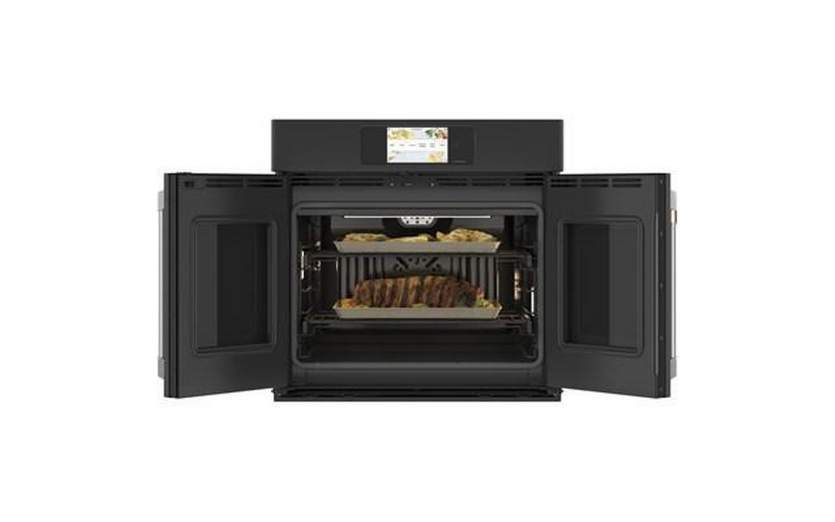 This 30-inch wide Café french-door wall oven features True European Convection with Direct Air, self-clean with steam clean option, a 7" full-color touch LCD screen and a 5.0 cu.ft. oven capacity.