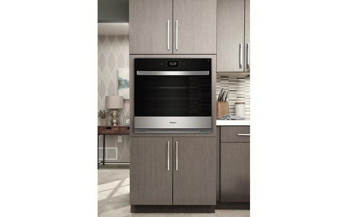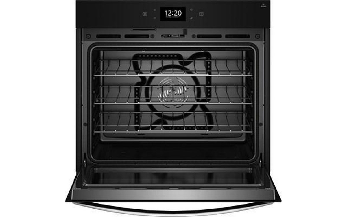 This 30-inch 5.0 cu.ft. Single Wall Oven by Whirlpool features 3 standard racks, control-lock mode, rapid preheat, a Smart/connected with multi-step cooking, is fingerprint resistant and comes with 8-in-1 cooking cycles such as bake, convect bake, broil, convect broil, convect roast, keep warm, Frozen Bake™