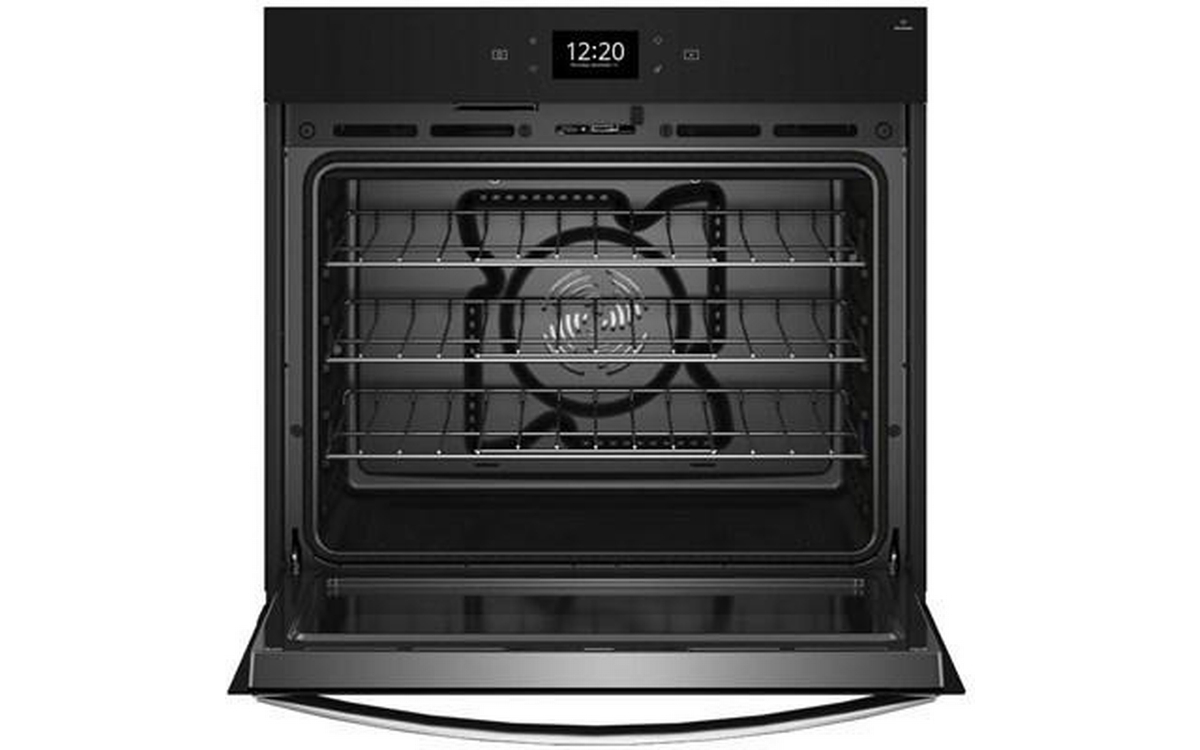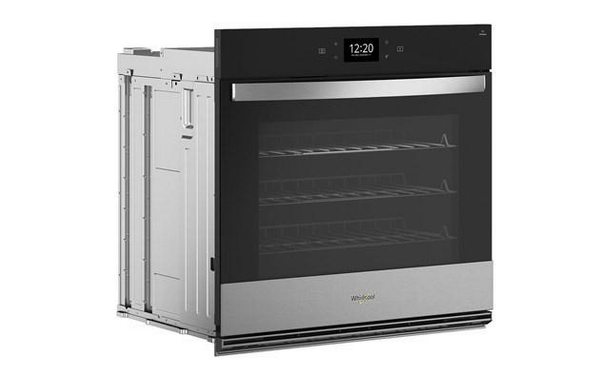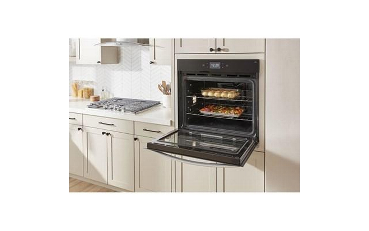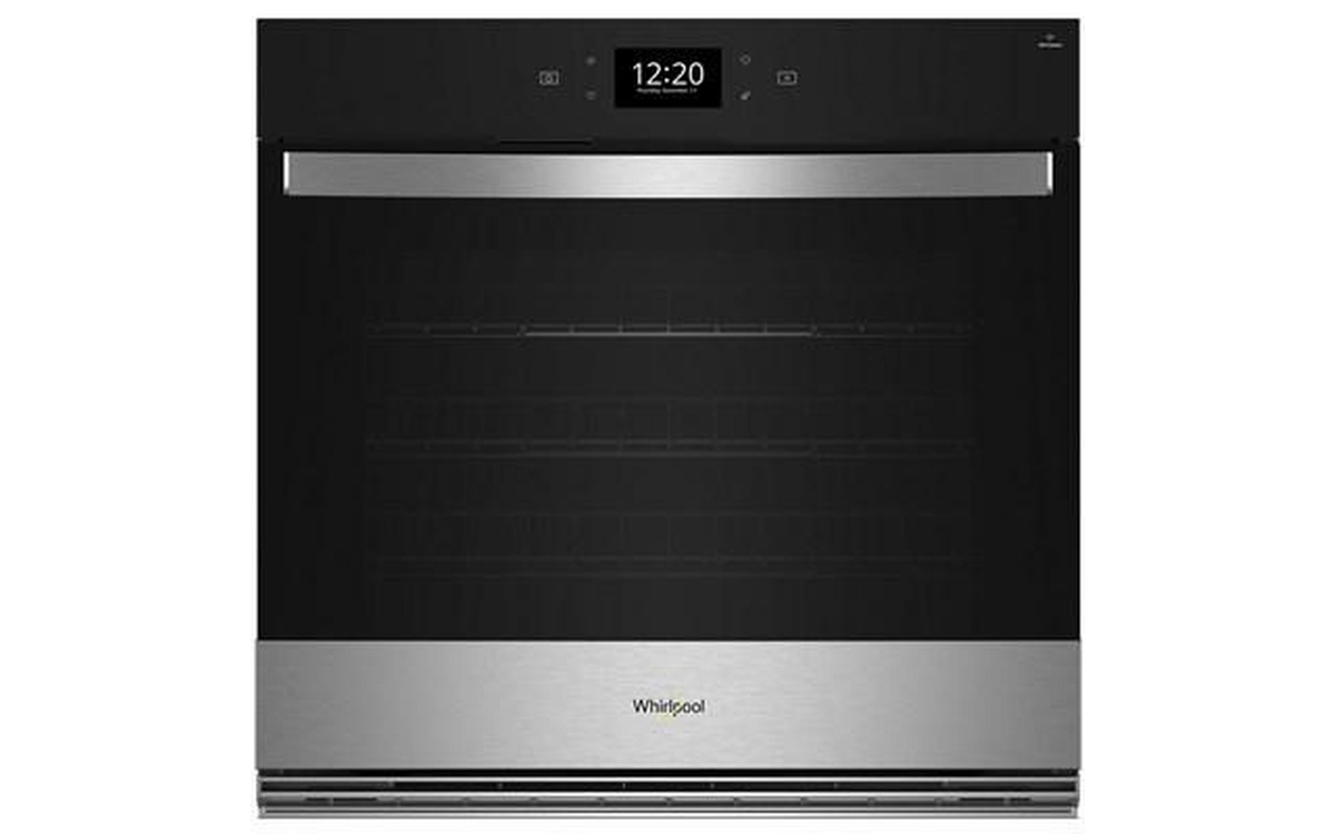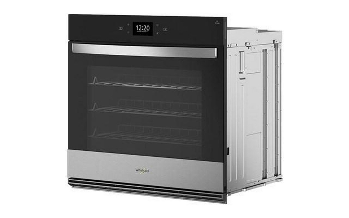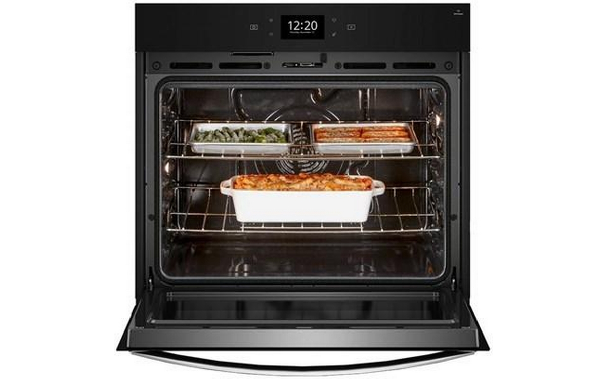 This 27-inch 4.3 cu.ft. Single Wall Oven by Whirlpool features 3 standard racks, control-lock mode, rapid preheat, a Smart/connected with multi-step cooking, is fingerprint resistant and comes with 8-in-1 cooking cycles such as bake, convect bake, broil, convect broil, convect roast, keep warm, Frozen Bake™