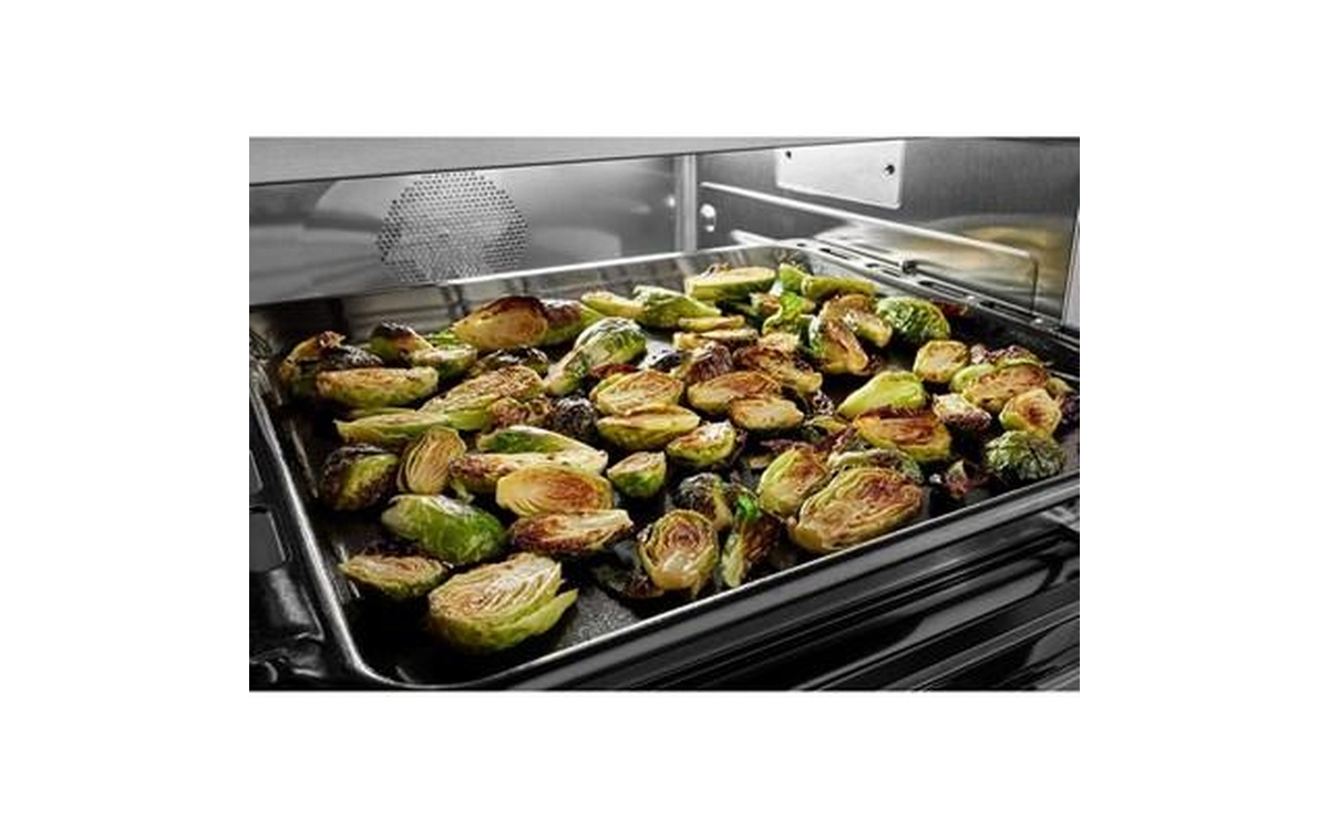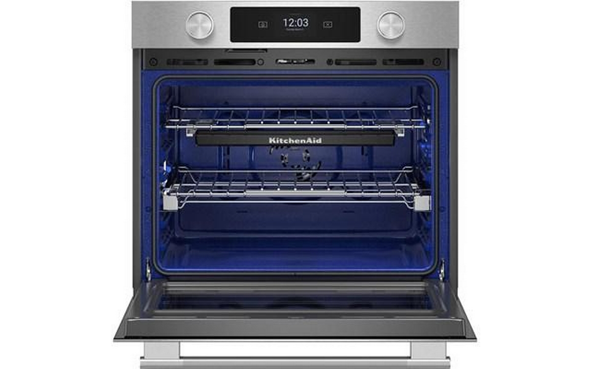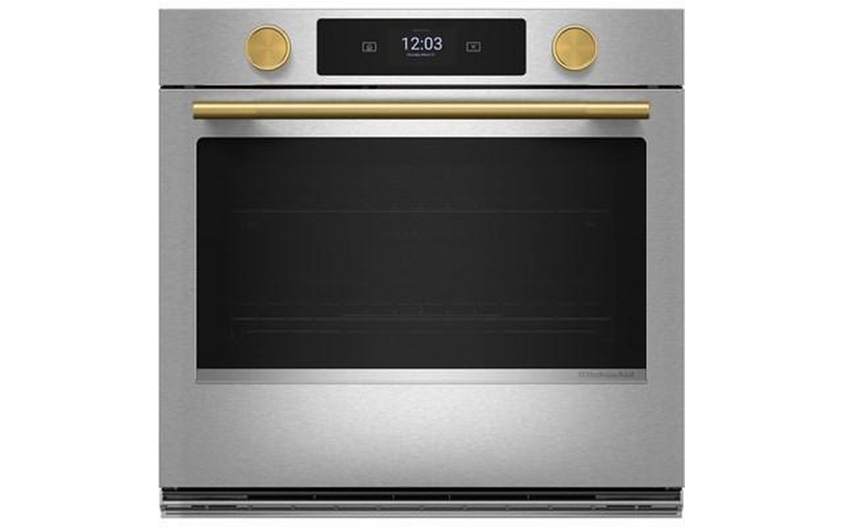 Explore new recipes with built-in tips on this KitchenAid smart wall oven, featuring our Most Precise Even-Heat™ True Convection and Assisted Cooking Modes. LED Touchscreen display and backlit knobs allow for tactile display navigation. The backlit knobs also provide a visual cue throughout the cooking process, illuminating when the oven is preheating and pulsing when cooking is finished. Designed to be personalized, these wall ovens are available in a curated palette of exterior finishes and can be customized with mixed metal hardware.