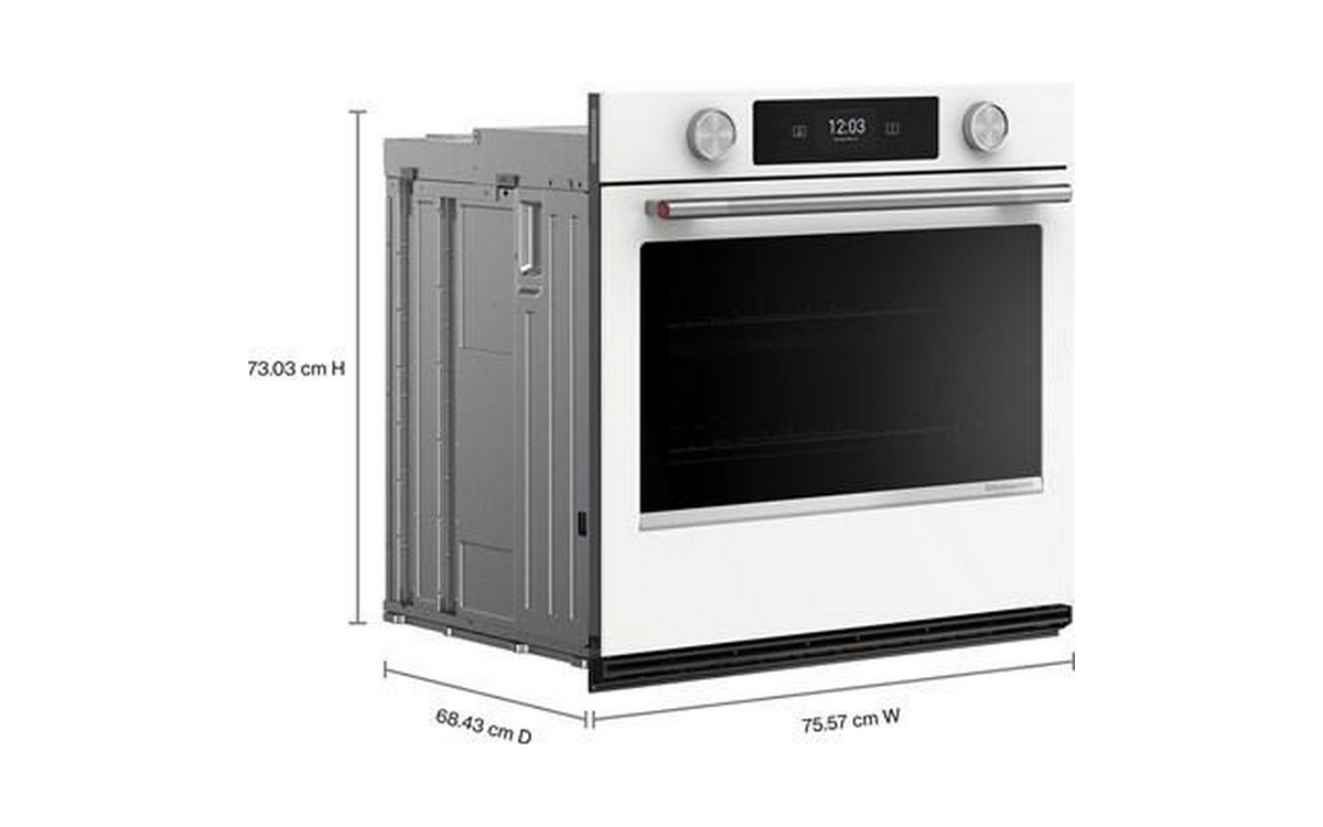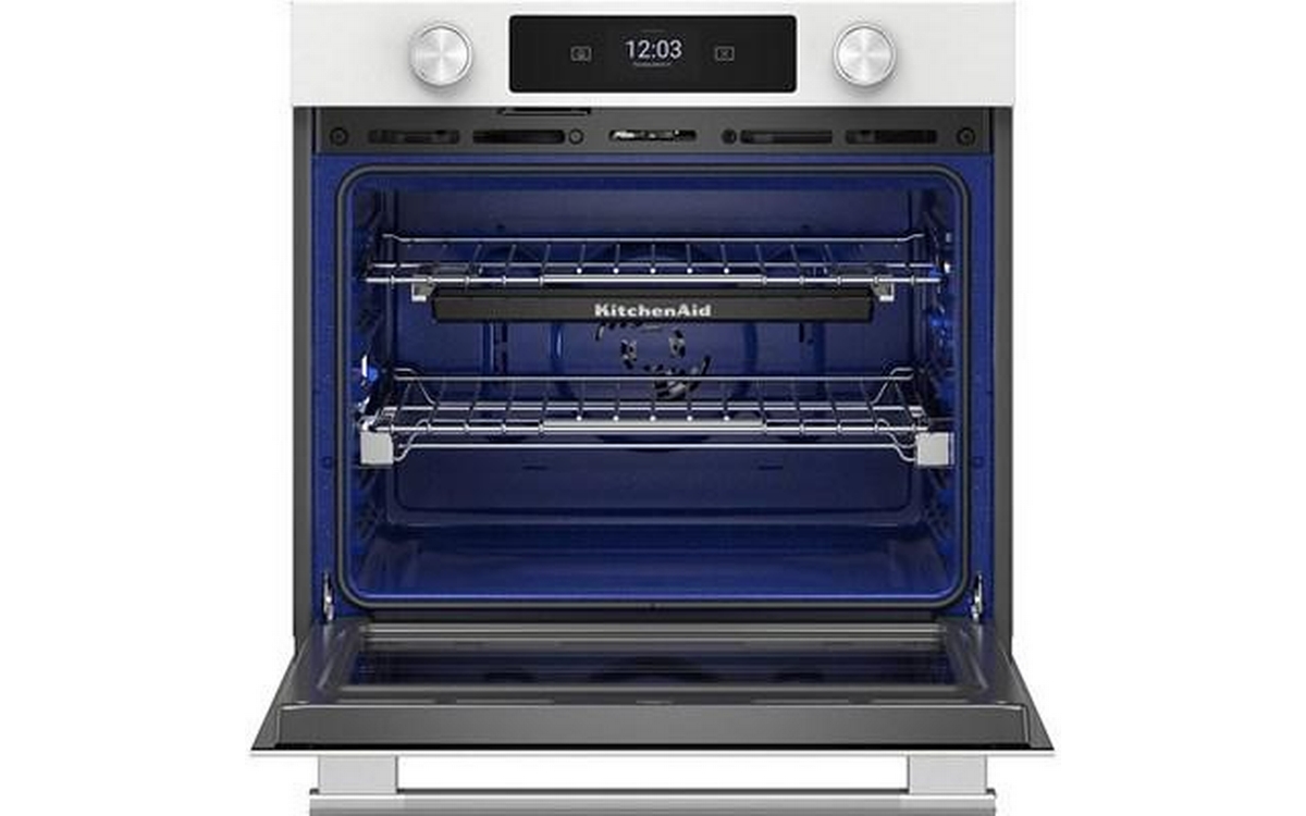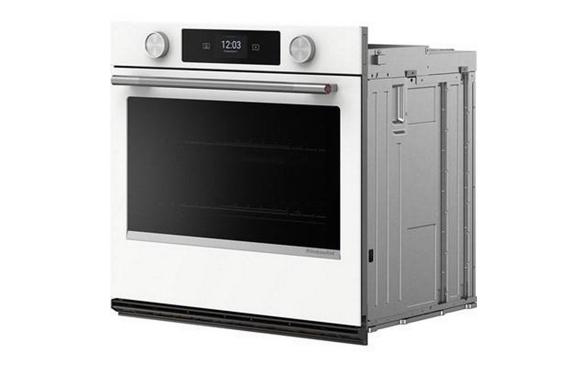 Explore new recipes with built-in tips on this KitchenAid smart wall oven, featuring our Most Precise Even-Heat™ True Convection and Assisted Cooking Modes. LED Touchscreen display and backlit knobs allow for tactile display navigation. The backlit knobs also provide a visual cue throughout the cooking process, illuminating when the oven is preheating and pulsing when cooking is finished. Designed to be personalized, these wall ovens are available in a curated palette of exterior finishes and can be customized with mixed metal hardware.