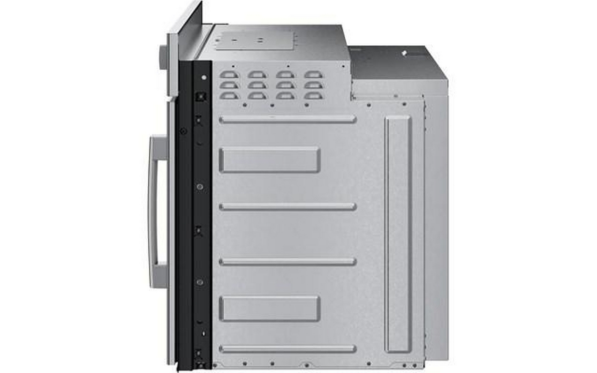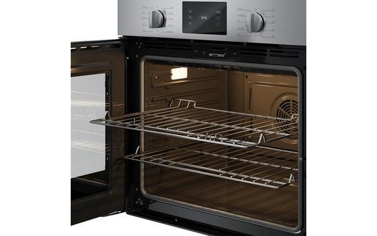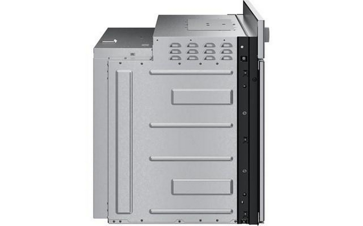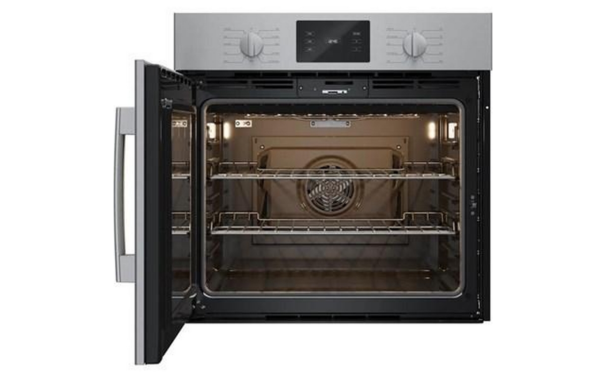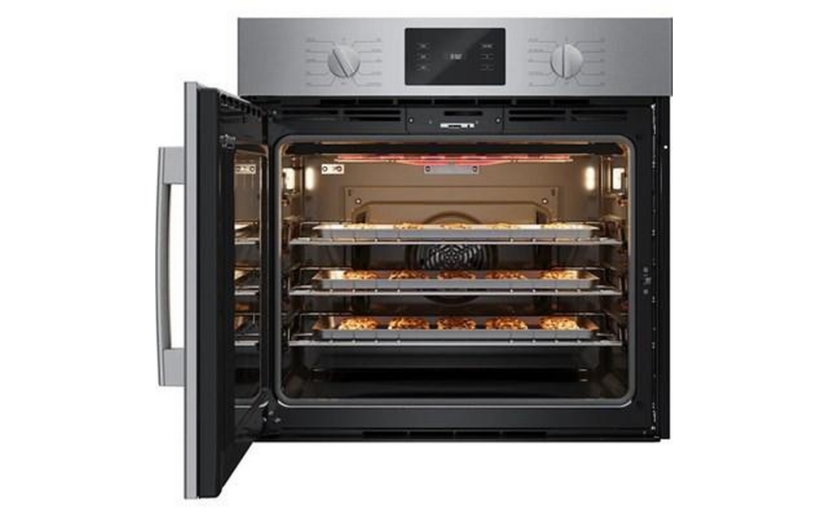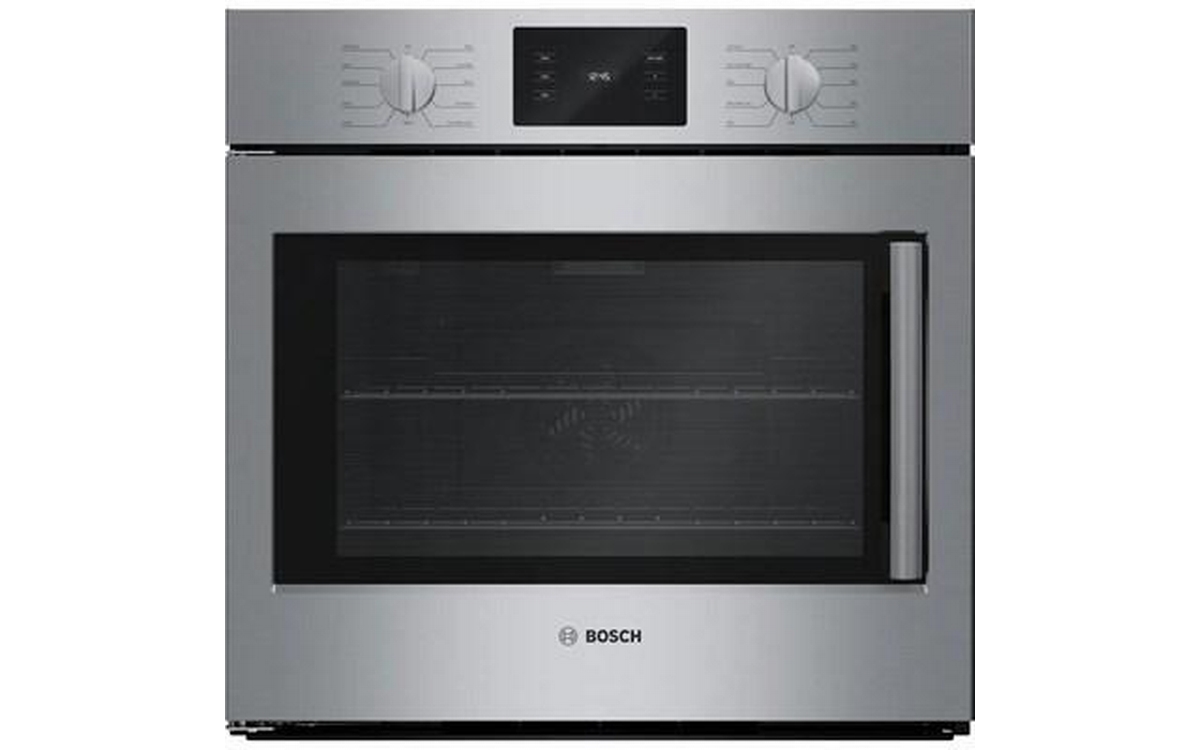 The Bosch wall oven features a SideOpening door for easier cavity access, Convection Multi-Rack and heavy metal stainless steel knobs.