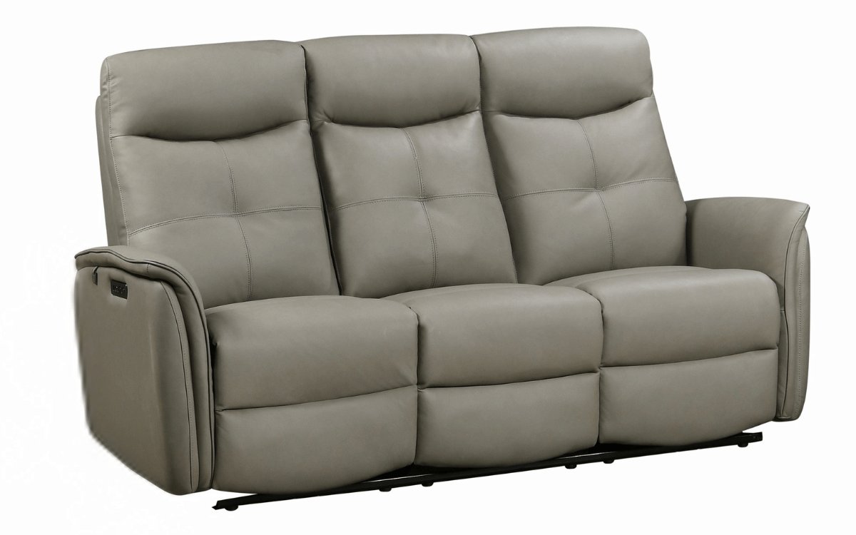 Designed to welcome the whole family in comfort and style, the Oslo reclining sofa in medium gray full-grain leather combines contemporary design with functionality. This model features a 19-inch shallow seat depth, allowing your feet to rest naturally on the floor while keeping your back properly supported against the backrest for optimal comfort. With three spacious seats—two of which are power-reclining and equipped with motorized headrests—it offers a personalized relaxation experience for everyone. Its clean, modern design blends seamlessly with any interior, creating a living space that is both inviting and sophisticated.