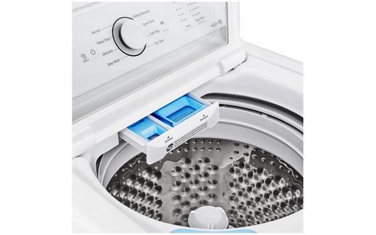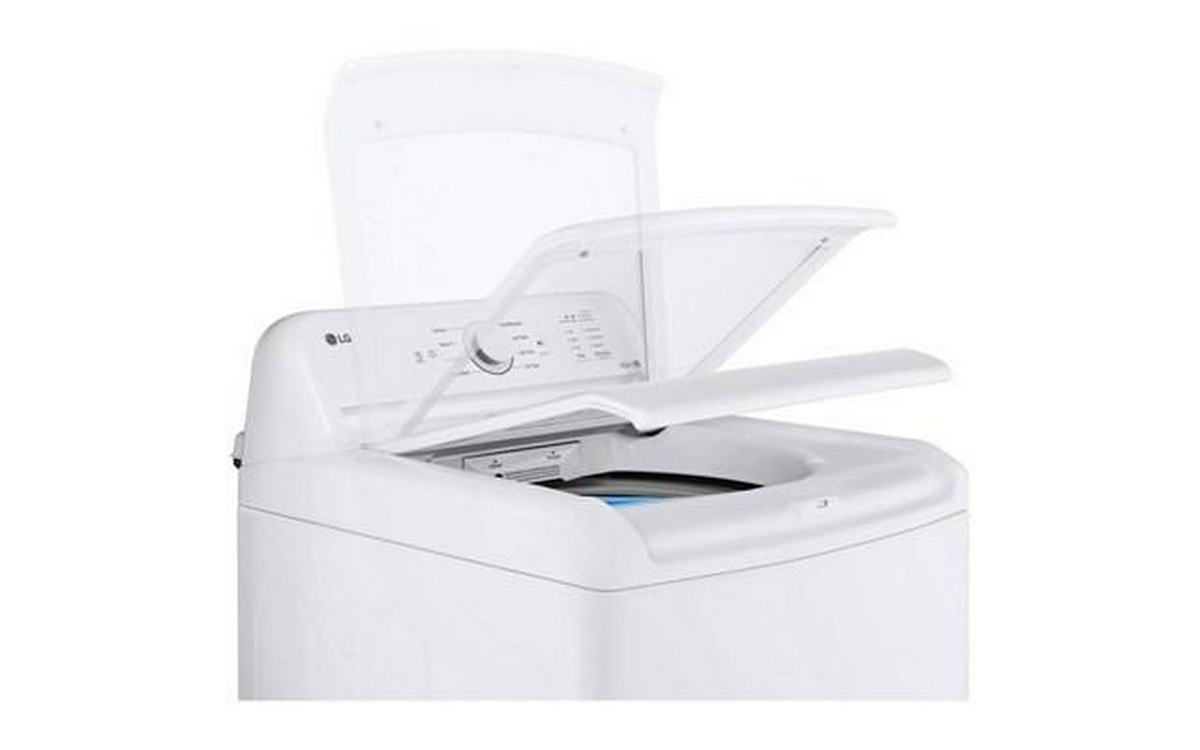 This LG top load washer features the SlamProof® Glass Lid, True Balance® Anti-Vibration System, Smart Diagnosis, and NeveRust® Stainless Steel Drum.