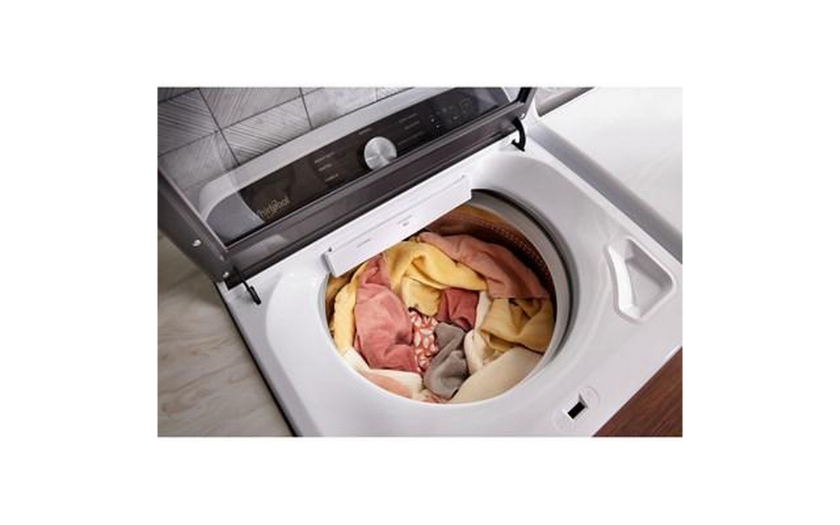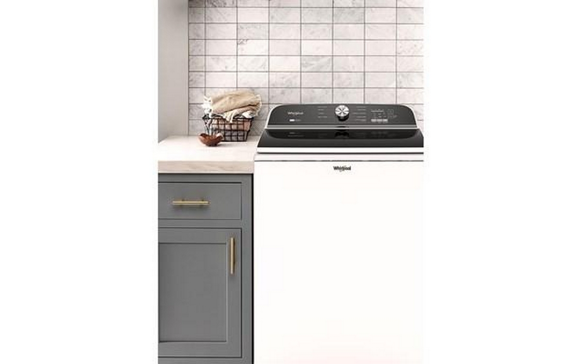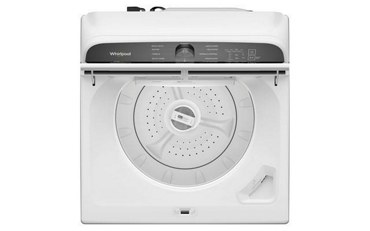 The Top Loading Washer by Whirlpool features a stylish design and colour, full-width slow-close glass lid, quick wash cycle and deep water wash option, smooth spiral stainless steel drum, and Direct Drive motor.