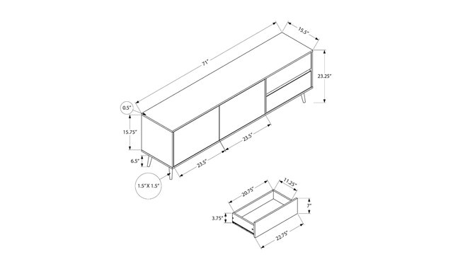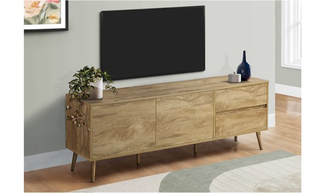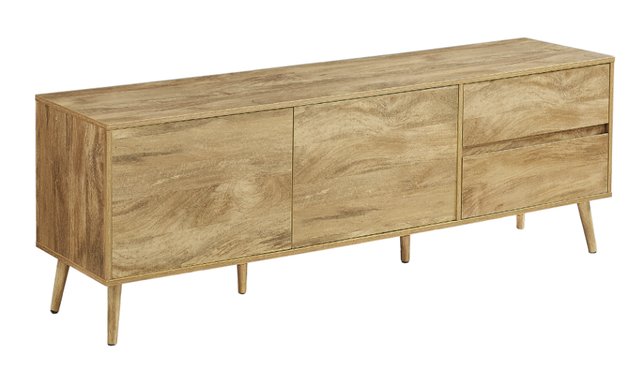 Make a statement in your living room, family room or bedroom with this trendy TV stand in mid-century design and light walnut veneer finish. This 183 cm unit combines retro styling with elegance and functionality. Built to last, it features solid wood legs and an easy-to-clean top for worry-free maintenance. Two easy-open closed storage drawers and two storage cabinets, each with an adjustable shelf, help you keep your multimedia essentials organized and out of sight. The push-lock mechanism adds a modern touch, while the two cable management ports at the back keep wires tidy. This contemporary-styled TV stand is also easy to assemble, with illustrated instructions and everything you need included. For your convenience, this multimedia unit comes with a 5-year limited warranty against manufacturing defects, ensuring a long-lasting, quality piece of furniture. Designed with solid construction, you'll enjoy this multimedia entertainment center for many years to come.