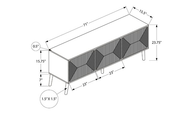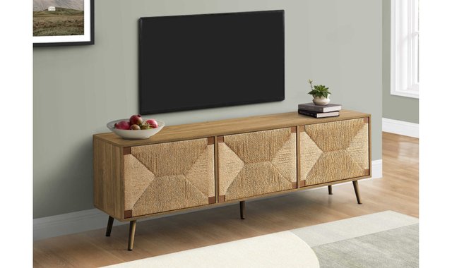 Transform your living space into a chic multimedia entertainment center with this elegant, modern TV stand! This 72-inch-long cabinet in light walnut veneer, with natural seagrass cabinet doors, perfectly embodies on-trend style. Built to last, this TV stand offers solid wood legs, three large enclosed storage cabinets, with an adjustable shelf in the center compartment, and two cable management ports in the back to keep your space tidy and organized. The snap-lock mechanism for easy opening and closing of cabinet doors adds a contemporary touch, while the easy-clean tray simplifies maintenance. Easy to assemble with illustrated step-by-step instructions and all necessary hardware included, this visually appealing TV stand will be a focal point in your living room, bedroom or family room. With a 5-year limited warranty against manufacturing defects, you can rest easy knowing you've invested in a quality TV stand. Opt for a modern mid-century look with this TV stand, which combines solid construction with a natural touch of seagrass.