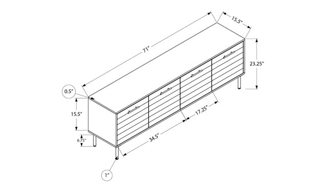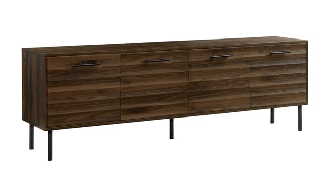 Add a touch of fashion to your entertainment space with this elegant and refined 72” TV stand, featuring a rich dark brown laminate wood finish on all sides. Designed for the trendiest customers, this mid-century transitional console features two spacious storage cabinets with a wavy front and an adjustable shelf inside each cabinet, perfect for keeping your media essentials organized and out of sight. Sturdy construction and stable black metal feet ensure long-lasting quality, while the easy-to-clean top makes maintenance a breeze. The 4 hidden cable management holes at the back ensure that this TV stand is both functional and fashionable. Make a statement in your living room, bedroom or family room with this transitional multimedia entertainment center, easy to assemble with illustrated instructions and all hardware included. Backed by a 5-year limited warranty for your peace of mind, this durable TV console with plenty of enclosed storage brings on-trend style to any space.