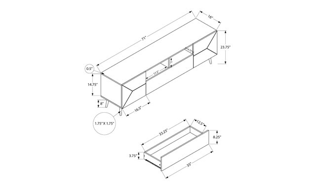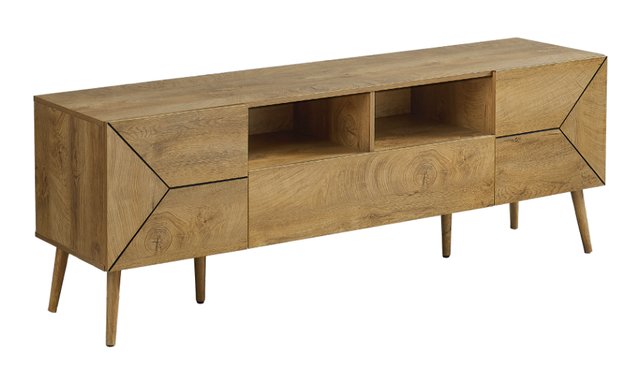 Make a statement in your living room, family room or bedroom with this on-trend 72” TV stand, featuring a smooth light walnut veneer finish and plenty of storage space. This TV stand boasts retro mid-century styling, with solid construction that's both elegant and functional. It offers plenty of space with 2 open compartments, 1 large easy-open storage drawer and 2 closed cabinets with elegant raised lines, to keep your multimedia essentials organized. The 2 cable management ports at the back keep your wires tidy and out of sight. Built to last, this unit also features solid wood legs and an easy-to-clean top for hassle-free maintenance. Easy to assemble with illustrated instructions and everything you need included, this multimedia storage unit will be ready to use in no time. For your convenience, we offer a 5-year limited warranty against manufacturing defects. Enhance your multimedia entertainment center with this quality, durable and trendy piece of furniture.