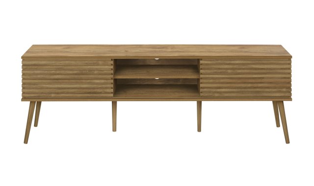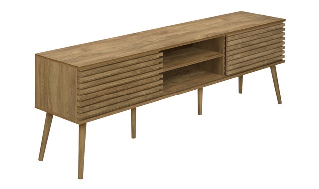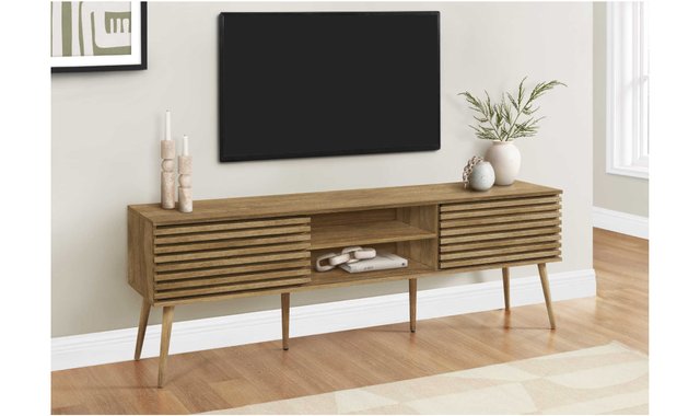 Introducing our elegant TV stand, the perfect addition to any trendy living space! This 72-inch walnut laminate cabinet isn't just a piece of furniture, it's also a statement piece that perfectly combines fashion and function. Constructed with solid wood legs of durable design, this TV stand offers both open storage shelves and closed storage options to keep your space organized and clutter-free. Sliding doors with panels on the storage cabinets add retro style, while cable management holes behind the fixed shelves showcase audio-visual components. With its trendy styling and easy-to-clean top, this multimedia console will be a practical addition to your home. Easy to assemble with the included hardware, you can enhance your living room or bedroom with this contemporary multimedia entertainment center. Plus, with a 5-year limited warranty, you can trust the quality and longevity of this solidly built piece.