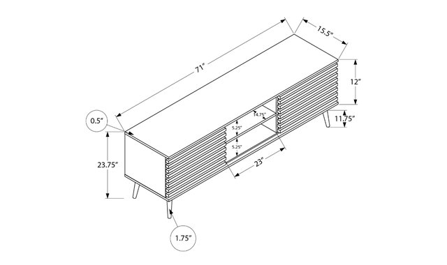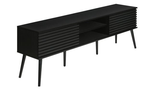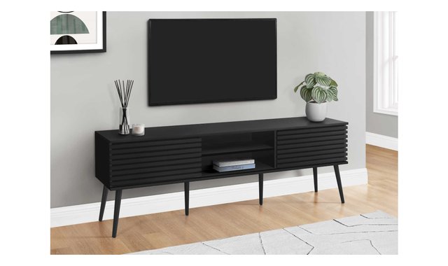 Introducing our elegant TV stand, the perfect addition to any trendy living space! This 72-inch black laminate cabinet isn't just a piece of furniture, it's a statement piece that perfectly combines fashion and function. Constructed with solid wood legs of durable design, this TV stand offers both open storage shelves and closed storage options to keep your space organized and clutter-free. Sliding doors with panels on the storage cabinets add retro style, while cable management holes behind the fixed shelves showcase audio-visual components. With its trendy styling and easy-to-clean top, this multimedia console will be a practical addition to your home. Easy to assemble with the included hardware, you can enhance your living room or bedroom with this contemporary multimedia entertainment center. Plus, with a 5-year limited warranty, you can trust the quality and longevity of this solidly built piece.