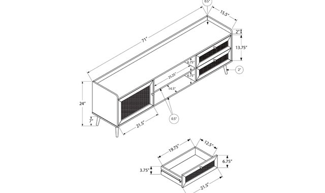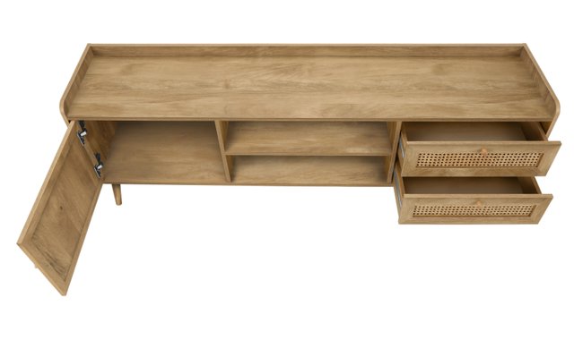 Introducing the perfect fusion of function and fashion with our 72-inch TV stand. Durably designed with a walnut laminate finish, this multimedia entertainment center offers the perfect space for your big-screen TV. Built with adjustable solid wood legs and rattan front panels for a casual vibe, this transitional-style console includes a spacious storage cabinet and 2 drawers with wooden knobs, as well as 2 wire management holes behind the fixed open shelf for effortless organization. Whether you want to place this console in the living room or bedroom, it's the perfect piece to get the storage you need and the style you want. Easy to assemble thanks to detailed, illustrated instructions, this high-quality TV stand also comes with a 5-year limited warranty against manufacturing defects, ensuring your satisfaction for years to come.