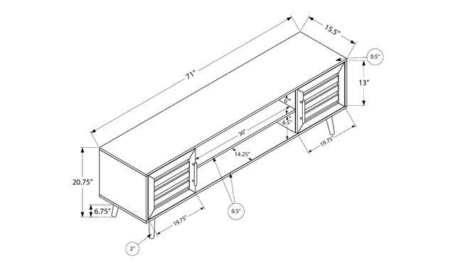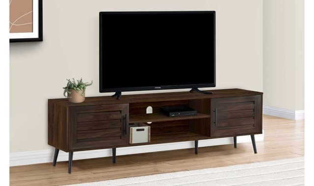 Enhance your home entertainment space with this elegant and functional 72-inch console in wood-look brown laminate finish. It's durably designed with two closed cabinets featuring elegant black metal handles and an open shelf with a wire management hole, providing ample storage space for all your media and entertainment needs. Sloping black solid wood legs ensure the stability of this TV console, which will harmonize perfectly with your existing décor. Easy to assemble, this media unit includes all hardware and illustrated assembly instructions, as well as a 5-year limited warranty against manufacturing defects. Add this fashionable TV stand to your living room or bedroom and create an effect you'll love for years to come.