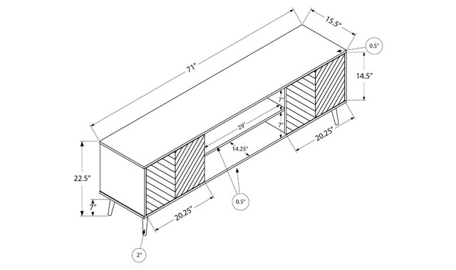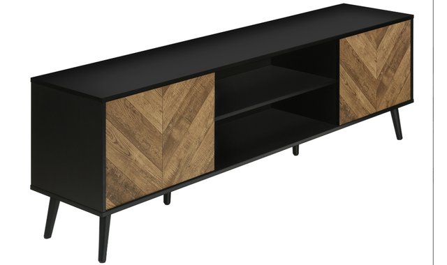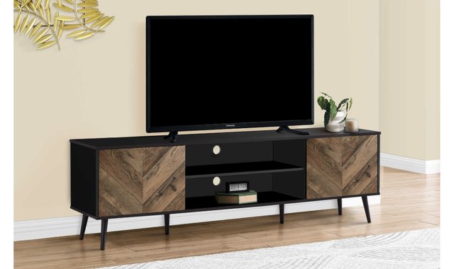 This 72-inch TV stand is modern and well-organized. The brown and black laminate finish, the durably designed black wood legs and the sloping groove lines on the wood-look doors give a unique and elegant contemporary touch. The two wire management holes behind the fixed shelf allow for efficient storage and organization, and the two closed cabinets with a push-lock mechanism make it easy to open and close for access to books, media and play accessories. The 5-year limited warranty against manufacturing defects ensures that you'll be able to enjoy this TV stand for many years without worry. Easy to assemble thanks to the included illustrated instructions, this console is perfect as a multimedia entertainment center for your living room, bedroom or workspace.