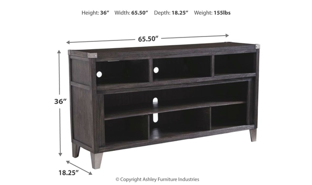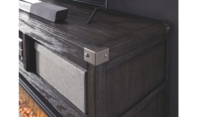 Make watching TV a joy with this large TV stand. Top surface accommodates up to 70-inch TVs. Its rustic-industrial style is sure to complement any contemporary decor through gray coloration, squared edges, zinc-tone corner bracket accents and nailhead detailing. Several vented open cubbies offer impressive shelf space, convenient for keeping all of your electronic gear within reach. Handy cutouts keep cords out of sight. Large center opening accommodates shelving insert (included) or the W100-22 large fireplace unit (sold separately).