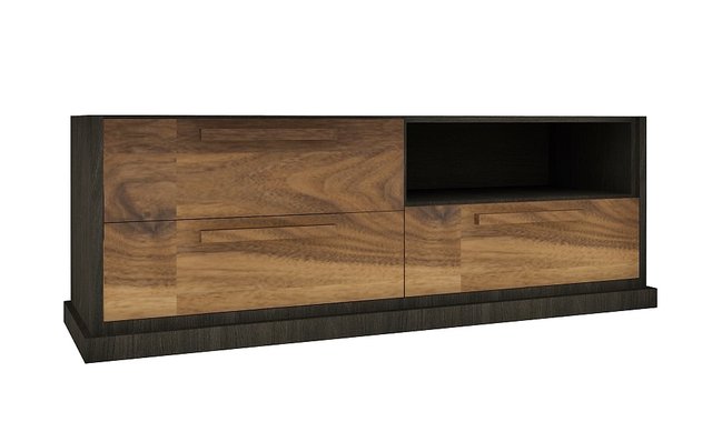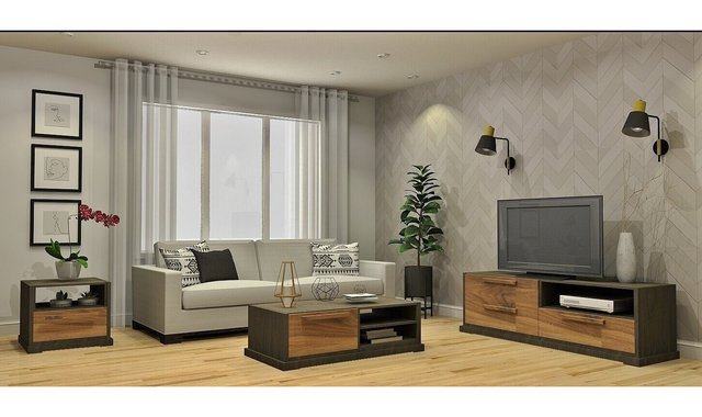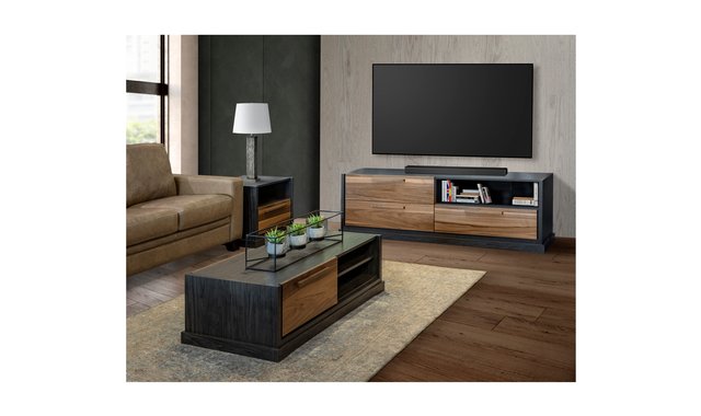 64-in. TV base made of premium quality thermodiffused melamine with a charcoal and walnut finish. You can complete your decor with the center and end tables.