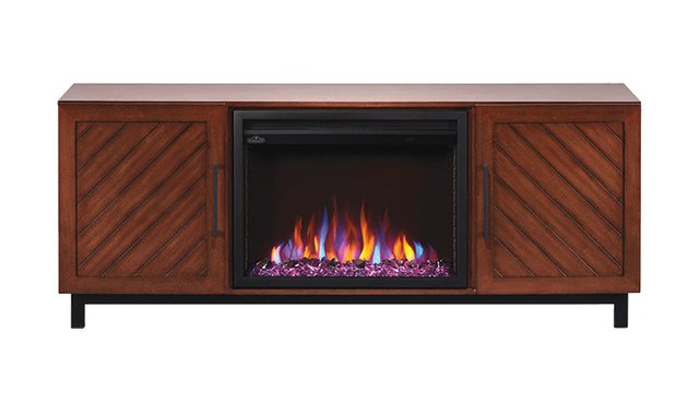 Rustic Bella Cabinet Set with Cineview Fireplace. Up to 5000 BTU. "Heats up to 400 sq. ft. "120V/1465 watts "ECO Mode: Half heat operation, using half the energy "Boost Mode: Maximum heat operation and increased blower speed "Adjustable flame speed and brightness " Touch control panel with enhanced display Oak log set and black glass crystals included