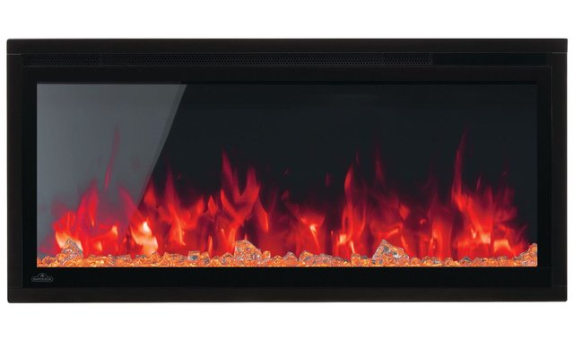 Description Completely transform any space with the Entice 36 Wall-Hanging Electric Fireplace. The full flame pattern creates a striking visual impact, especially with the ability to change the flame color and ember bed to match your mood and style. Have full control over your fireplace with the remote, easily adjusting the flame intensity, colors, ember bed color, brightness, blower, heat output, and timer. Ready to go right out of the box, no gas fitter required, just hang the Entice on the wall and plug in. The shallow depth means that this fireplace doesn't intrude into your living space. A reflective rear panel expands the depth of the flames for a more immersive experience without taking up physical space in your room. For a more seamless look, this electric fireplace can be fully or partially recessed into a wall. See the fireplace and not the frame with a minimalist, nearly frameless finish. Complete any room with an easy-to-install Entice 36 Wall-Hanging Electric Fireplace. Key Features The Napoleon Entice™ 36 Wall Hanging Electric Fireplace is 16.94-inches tall, 36-inches wide, and 5.4-inches deep (43.03 cm tall, 91.44 cm wide, 13.82 cm deep) Quickly heat large rooms up to 400 square feet thanks to the robust heat output of 5,000 BTU's and 1,500 Watts powering the unit Ready to use right out of the box, just hang on the wall and plug it in to a regular 120V outlet The black, nearly frameless finish surrounding this modern, linear, electric fireplace creates a minimalist look that doesn't interfere with your décor, instead it enhances the fire aspect of the fireplace The controls are easy to use, illuminating when you need them and dimming to hide when not in use. This ensures you have complete control without the illuminated buttons detracting from the overall look of the fireplace while you are relaxing Easily match the flame color and ember bed to your décor or mood by selecting one of ten flame and ten ember bed color options Enjoy this fireplace any time of day with the high intensity LED lights in both the flames and ember bed, ensuring that no matter how bright it is, you can still take pleasure in the view of your fireplace Large crystal clear cubes sparkle with contemporary luxury, reflecting the beautiful colours of the flames and the ember bed lights Installation is fast and easy with the included bracket for hanging. The unit is ready to go right out of the box, only taking a few minutes and couple of screws to hang This fireplace can be wallmounted or fully recessed into the wall, meaning that it won't protrude into the room at all. This provides a clean and seamless, contemporary look Don't get up, you can operate this fireplace from the comfort of your favourite spot with the included, full feature, remote control Birch and Driftwood logs available as add-ons to further customize the design