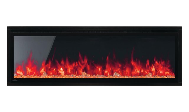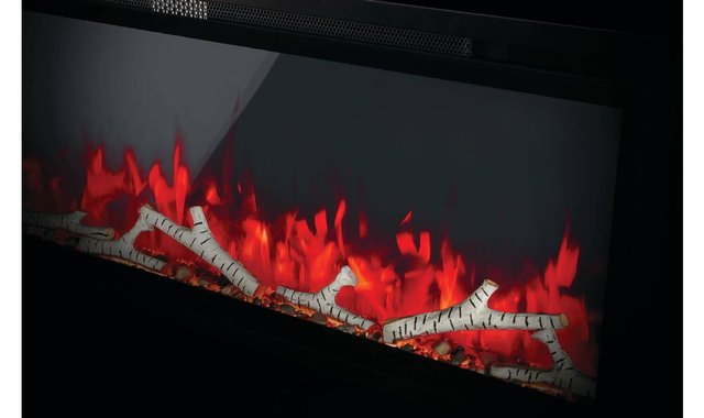 Description Completely transform any space with the Entice 42 Wall-Hanging Electric Fireplace. The full flame pattern creates a striking visual impact, especially with the ability to change the flame color and ember bed to match your mood and style. Have full control over your fireplace with the remote, easily adjusting the flame intensity, colors, ember bed color, brightness, blower, heat output, and timer. Ready to go right out of the box, no gas fitter required, just hang the Entice on the wall and plug in. The shallow depth means that this fireplace doesn't intrude into your living space. A reflective rear panel expands the depth of the flames for a more immersive experience without taking up physical space in your room. For a more seamless look, this electric fireplace can be fully or partially recessed into a wall. See the fireplace and not the frame with a minimalist, nearly frameless finish. Complete any room with an easy-to-install Entice 42 Wall-Hanging Electric Key Features The Napoleon Entice™ 50 Wall Hanging Electric Fireplace is 16.94-inches tall, 50-inches wide, and 5.4-inches deep (43.03 cm tall, 91.44 cm wide, 13.82 cm deep) Quickly heat large rooms up to 400 square feet thanks to the robust heat output of 5000 BTU's and 1,500 Watts powering the unit Ready to use right out of the box, just hang on the wall and plug it in to a regular 120V outlet The black, nearly frameless finish surrounding this modern, linear, electric fireplace creates a minimalist look that doesn't interfere with your décor, instead it enhances the fire aspect of the fireplace The controls are easy to use, illuminating when you need them and dimming to hide when not in use. This ensures you have complete control without the illuminated buttons detracting from the overall look of the fireplace while you are relaxing Easily match the flame color and ember bed to your décor or mood by selecting one of ten flame and ten ember bed color options Enjoy this fireplace any time of day with the high intensity LED lights in both the flames and ember bed, ensuring that no matter how bright it is, you can still take pleasure in the view of your fireplace Large crystal clear cubes sparkle with contemporary luxury, reflecting the beautiful Colours of the flames and the ember bed lights Installation is fast and easy with the included bracket for hanging. The unit is ready to go right out of the box, only taking a few minutes and couple of screws to hang This fireplace can be installed recessed fully into the wall, meaning that it won't protrude into the room at all. This provides a clean and seamless, contemporary look Don't get up, you can operate this fireplace from the comfort of your favourite spot with the included, full feature, remote control Birch and Driftwood logs available as add-ons to further customize the design