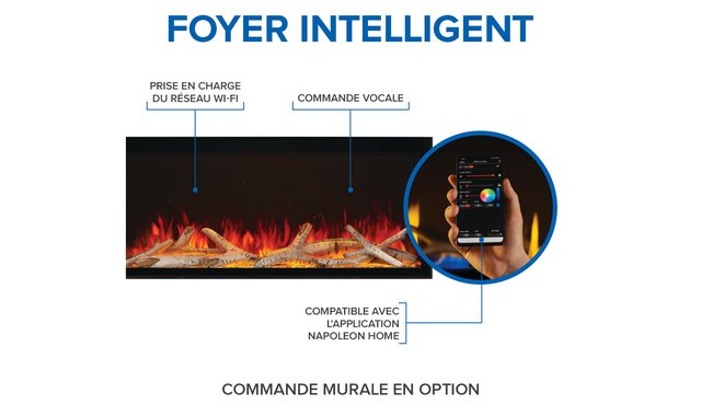 Description The Astound 74 FlexMount Electric Fireplace is the ideal addition to comfortable and connected living. Our unique spark technology further enhances the flames for intense realism, while the inclusion of Beach Fire logs and Woodland media customize the unit to match your personal tastes. Use the touch panel, included remote, voice, and mobile device control with the Napoleon Home App for unmatched mastery over your fireplace experience. Eco mode consumes less energy, while Boost mode adds an extra hit of heat on those chilly days. Customize your heat and color settings for each day of the week by setting a schedule. Thirteen ember bed and top light colors allow you to set the mood while optional and included glass and log sets ensure this fireplace matches your aesthetic. Not just a pretty fireplace, with its supremely flexible installation options and easy maintenance, the Astound can personalize any room or commercial space. Key Features SUPERIOR REALISM: Featuring flame colors and spark technology to mimic a real fire MORE INSTALLATION FLEXIBILIY: Wall mounted or partially recessed (3-sided) or fully recessed (1-sided, 2-sided or 3-sided). Plus, the included finishing edge panels and trim are ideal for applications requiring a modern seamless installation coverage (for fully recessed installs), offering a 0” trim-less appearance EASY CONNECTIVITY: Experience the value of connectivity with voice control (Google, Alexa) and a WiFi enabled app (Napoleon Home) CONTROL AT YOUR FINGERTIPS: Controls at your fingertips – included premium remote. Plus, Napoleon Home mobile app or optional wall mount control (perfect for commercial installations) COMMERCIAL SPACE-READY: Will make a statement in both homes and commercial spaces alike CUSTOMIZABLE: Included Beach Fire and Woodland Log kits and additional media options allow the interior of this electric fireplace to be customized ENERGY EFFICIENT: Run the fireplace in ECO mode. The unit will run at half heat, consuming less energy EXTRA COZY: Need some extra heat on a cool day, use BOOST mode. The heater runs at max heat with increased blower speed 3 YEAR WARRANTY: The Astound features a 3 Year Registered Warranty FRONT VENTED: The front vent projects heat into the room ensuring your coziness
