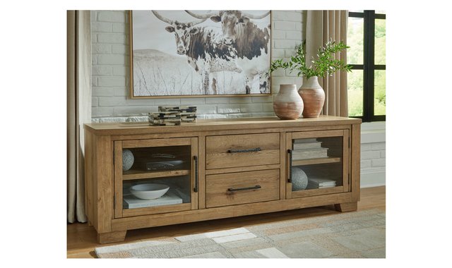 ***LIQUIDATION*** This TV stand expertly refines the raw beauty of wood, bringing a rustic vibe to urban contemporary design. It creates an organically beautiful feel in your living room—natural details on the wood are unique to each piece. Console and media storage is made easy with cabinets and drawers. And the stunning simplicity of the materials allows you to seamlessly coordinate this TV stand with your existing decor.