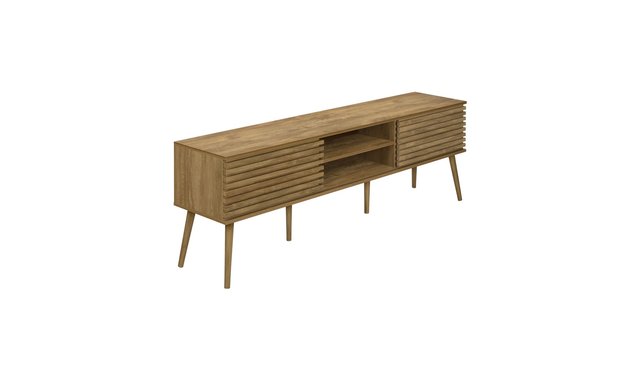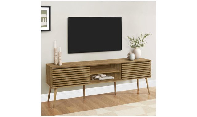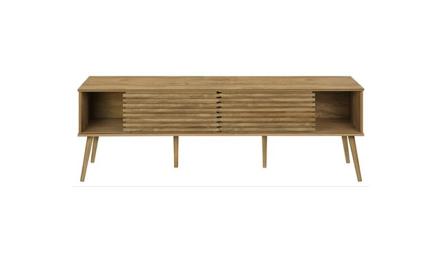 Introducing our sleek and stylish tv stand, the perfect addition to any trendy living space! This 71 inch walnut laminate beauty is not just a piece of furniture, but a statement piece that combines fashion and function seamlessly. Constructed with durably designed solid wood legs, this tv stand offers both open storage shelves as well as closed storage options to keep your space organized and clutter-free. The sliding doors with paneling on the storage cabinets add a retro style, while the easy cable management holes behind the fixed shelves showcase audio/visual components. With a fashionable style and an easy to clean top, this media console will be a practical addition to your home. Easy to assemble with hardware included, you can upgrade your living room or bedroom with this contemporary media entertainment center. Plus, with a 5 year limited warranty, you can trust in the quality and longevity of this solidly constructed piece. No assembled.