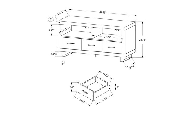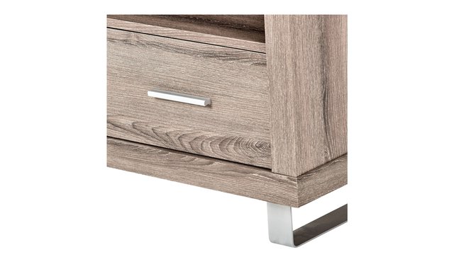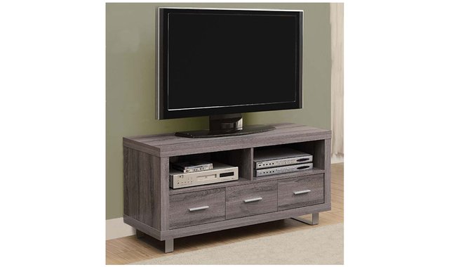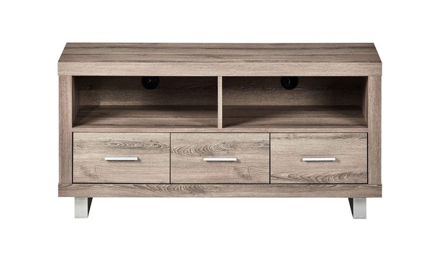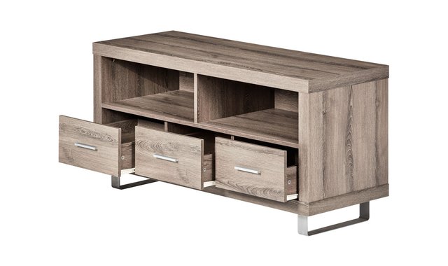 This contemporary style TV stand with a dark taupe aged wood-look finish features thick panels and modern metal-accented legs. The sleek profile of this console will be a perfect complement for all flat screens and components (up to 50 inches). It features 3 spacious storage drawers, 2 storage shelves and 1 integrated cable management system.