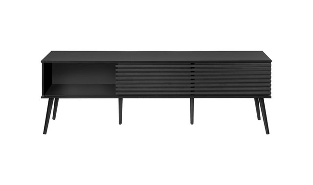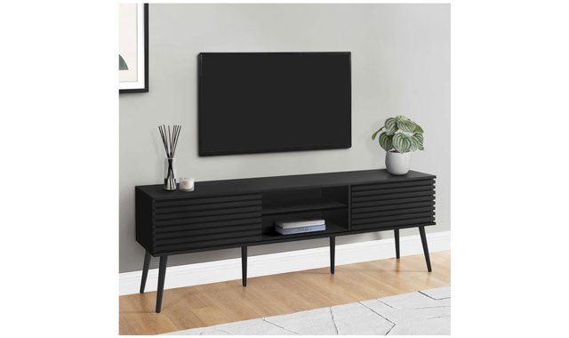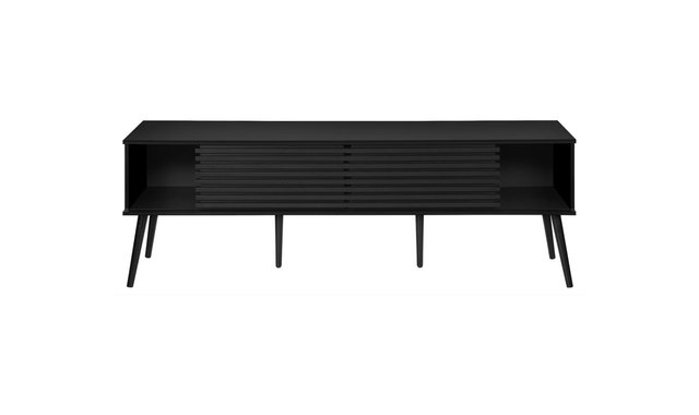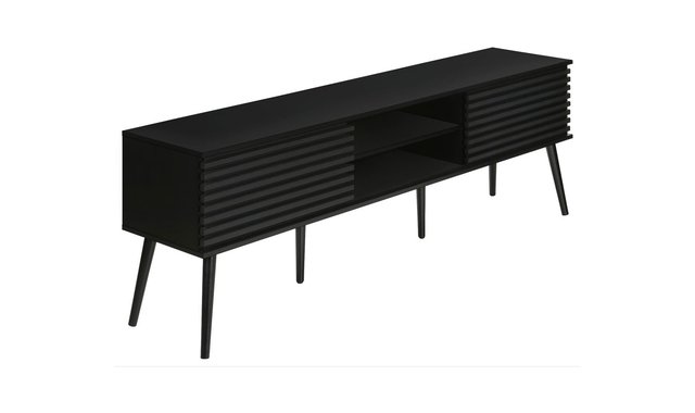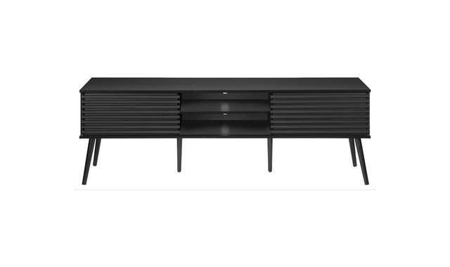 Introducing our sleek and stylish tv stand, the perfect addition to any trendy living space! This 71 inch black laminate beauty is not just a piece of furniture, but a statement piece that combines fashion and function seamlessly. Constructed with durably designed solid wood legs, this tv stand offers both open storage shelves as well as closed storage options to keep your space organized and clutter-free. The sliding doors with paneling on the storage cabinets add a retro style, while the easy cable management holes behind the fixed shelves showcase audio/visual components. With a fashionable style and an easy to clean top, this media console will be a practical addition to your home. Easy to assemble with hardware included, you can upgrade your living room or bedroom with this contemporary media entertainment center. Plus, with a 5 year limited warranty, you can trust in the quality and longevity of this solidly constructed piece.