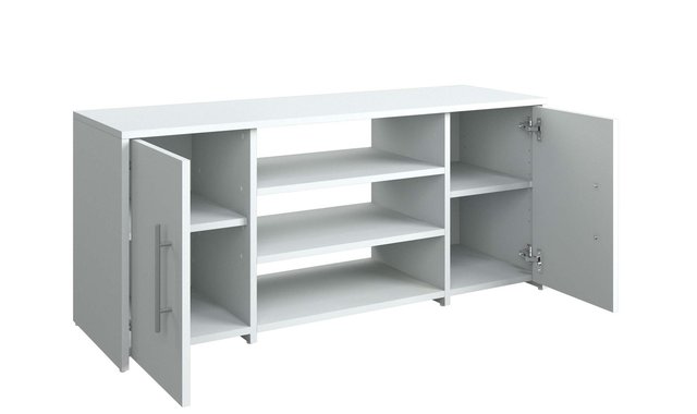 JAMES TV Stand: Elegance and Functionality Combined for the Perfect Entertainment Space The JAMES collection TV stand combines functionality and style, perfect for modern living spaces. Made from thermofused melamine, this stand is designed to withstand daily use while maintaining its elegant appearance. Available in multiple colors with the refined Prelude finish, each option offers a sophisticated texture and look. For the ''Sheer Beauty" color, the stand features the Karisma finish, which faithfully imitates the grain and authentic feel of natural wood, combining durability with a realistic appearance. The stand is equipped with tubular metal handles, adding a modern and sophisticated touch. The fixed shelves in the central section ensure sturdiness and strength to hold your multimedia equipment, while adjustable shelves are located behind each door, offering customizable storage options. With its elegant yet practical design, this stand is the ideal choice to organize and enhance your entertainment space.