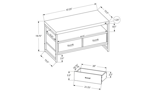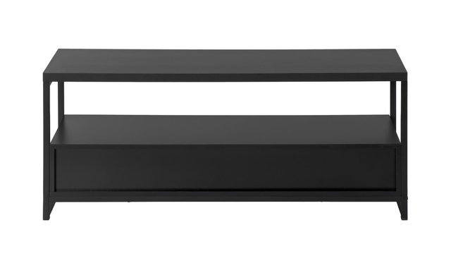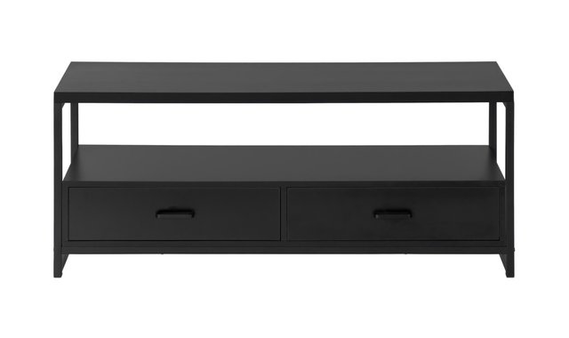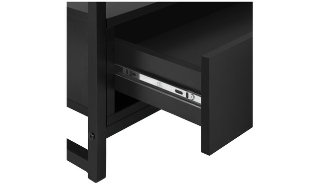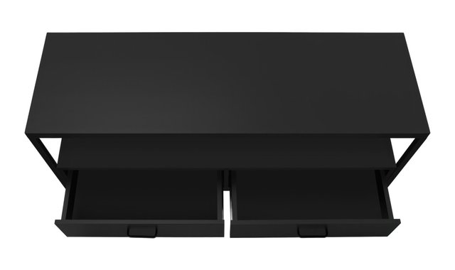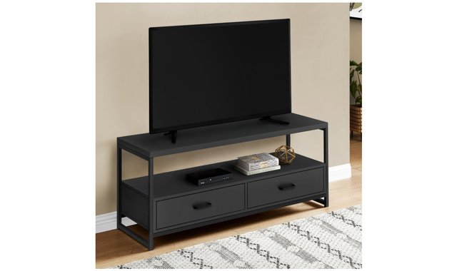 Simple with no frills, this versatile TV stand matches your décor without creating a clash. Equipped with 2 drawers and a vast space between its shelves, it allows you to completely customize it, either with a cute trinket in the middle of the shelf or a vast collection of electronics.