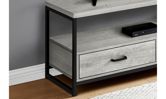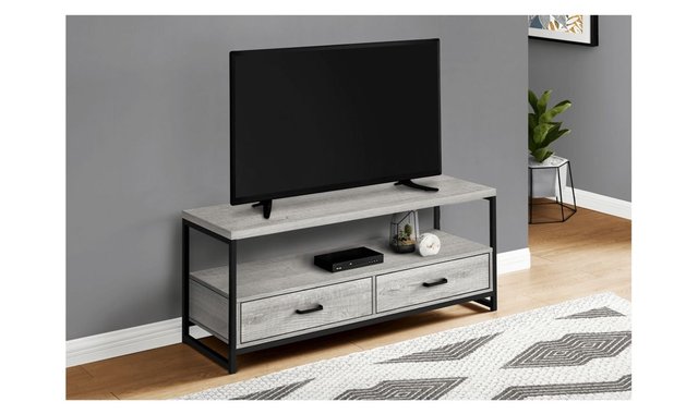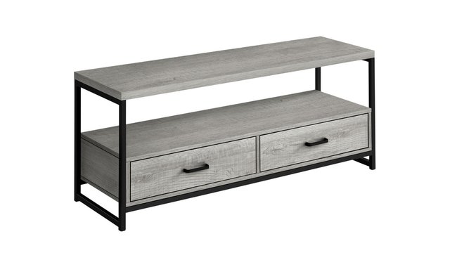This 48-inch TV stand in a grey wood-look finish with a black metal frame accommodates most TVs when centered on the top shelf. Its 2 tiers open-concept design and 2 drawers with metal slides offer plenty of storage space for entertainment center equipment. Double up on storage with this TV stand that offers 2 tiers and 2 drawers to neatly organize your electronics and other items. The spacious top shelf with thick-panel construction accommodates most TVs when centered. Below, the open-concept shelf provides ample room for audio-visual components and easy cable management, while the 2 drawers can store remotes, game controllers, or entertainment center accessories. The shelves and drawers in a grey wood-look finish are supported by a sleek black metal frame that gives the TV stand a modern look. With its space-saving design, this media console is a great choice for a living room or bedroom in an apartment, condo, or small home.