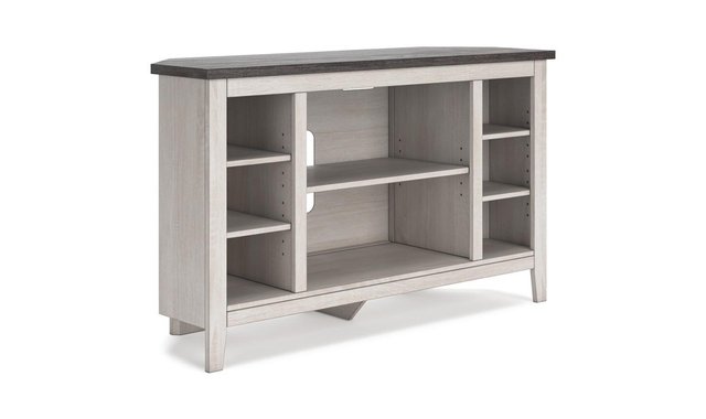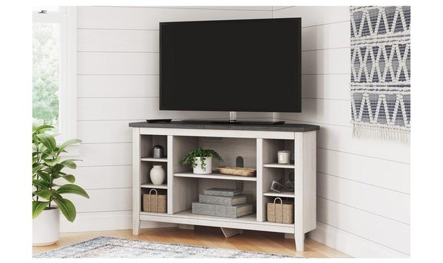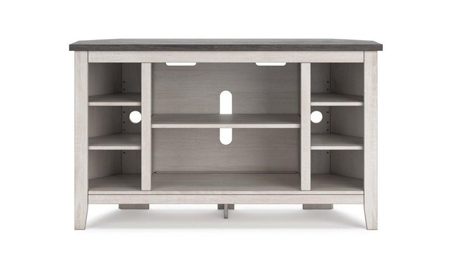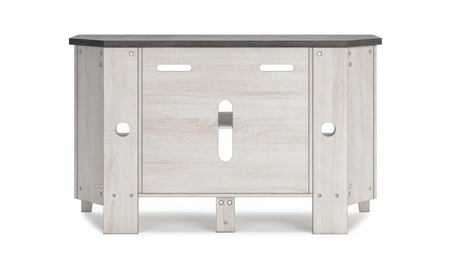 With its minimalist charm, this TV stand is right in tune with your relaxed approach to high style. Beautifully shaped to nestle into any corner, it’s well equipped with a flexible open-concept design and cutouts for wire management that enhance the clean-lined aesthetic. The look is ideal for modern farmhouse and contemporary settings.