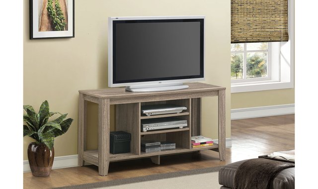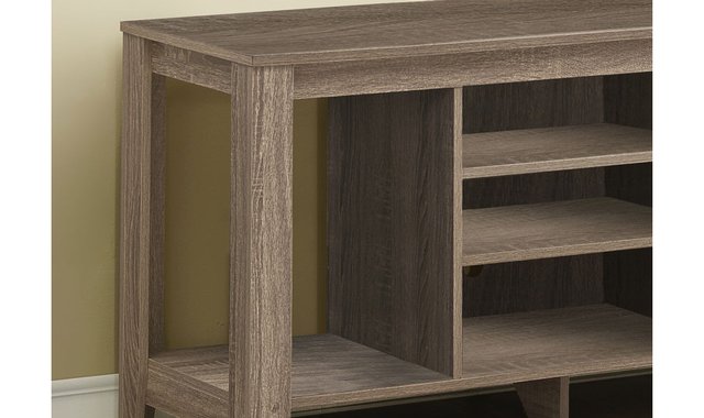 This simple, charming TV stand will look great in your living room or playroom. Ideal for smaller spaces, its taupe finish makes it a versatile choice that's at home anywhere. The entertainment centre features two adjustable centre shelves, another bottom shelf and two side shelves that allow you to display all of your AV components and decorative items. Accommodating all sizes of TVs with a centre stand, this media console adds character to your small home, apartment or condo. The ideal space-saving media stand for small homes, apartments or condos. Excellent storage versatility with two adjustable centre shelves, one bottom shelf and two side shelves. Heavy panel construction on all sides in a taupe finish. This TV stand has plenty of room for AV components, decorations or books; fits all widths of TVs with a centre stand.