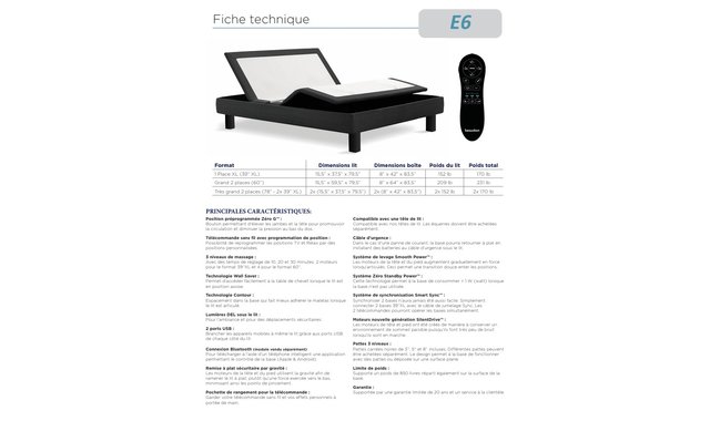 “Contour” and “Wall Saver” technologies, under-bed lighting, relaxation motors, USB ports… Our e6 adjustable bed will take you to a higher level of comfort.