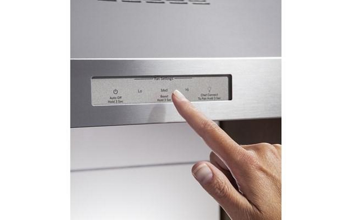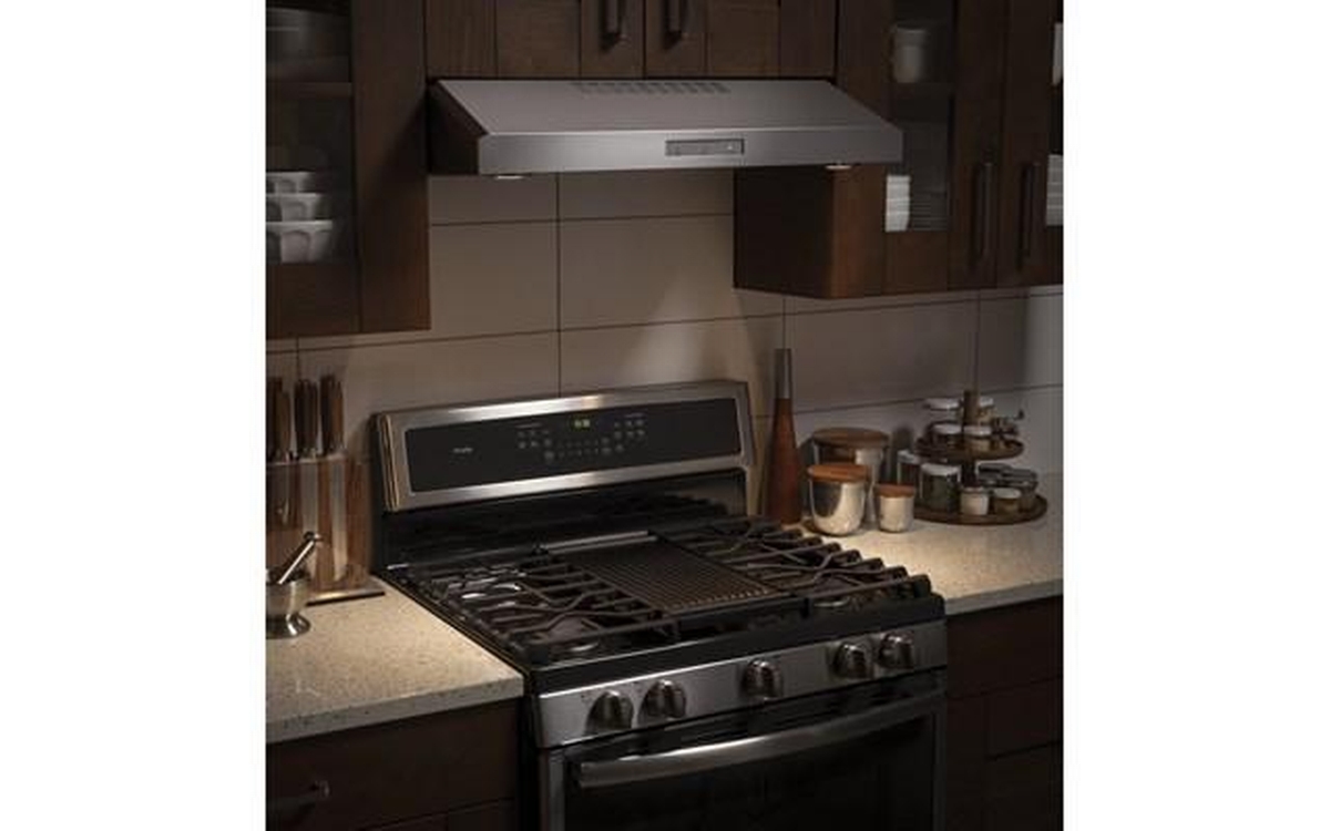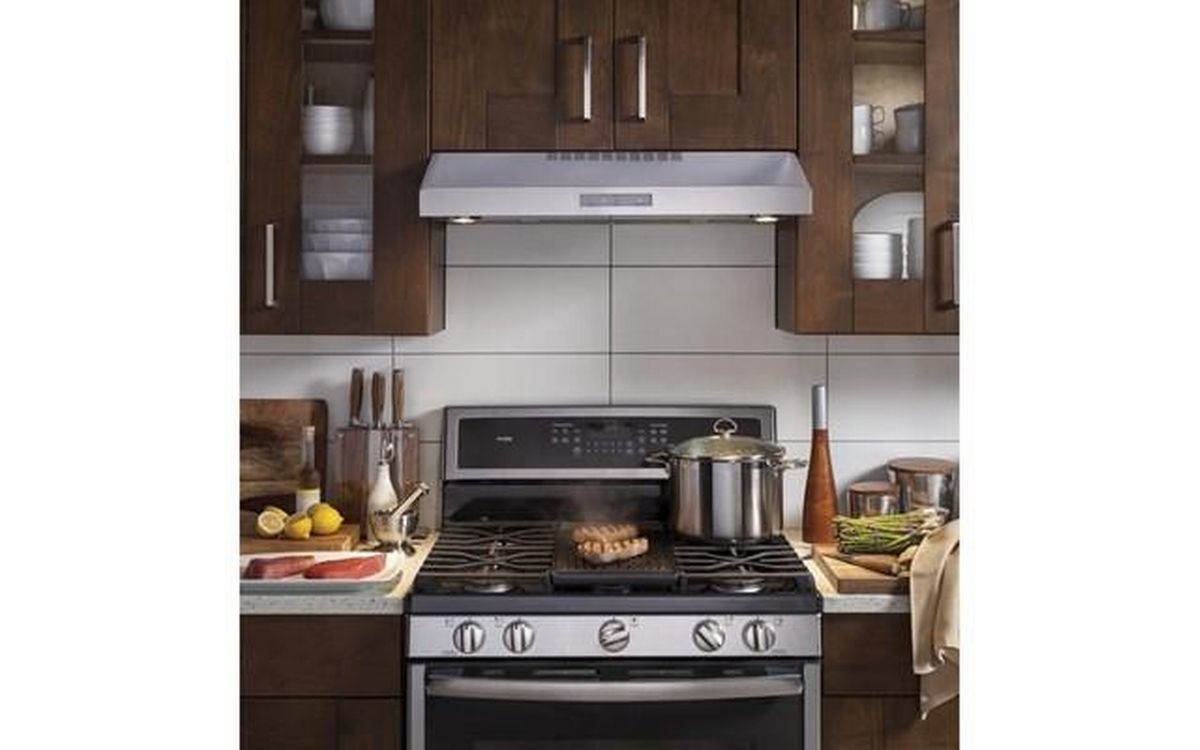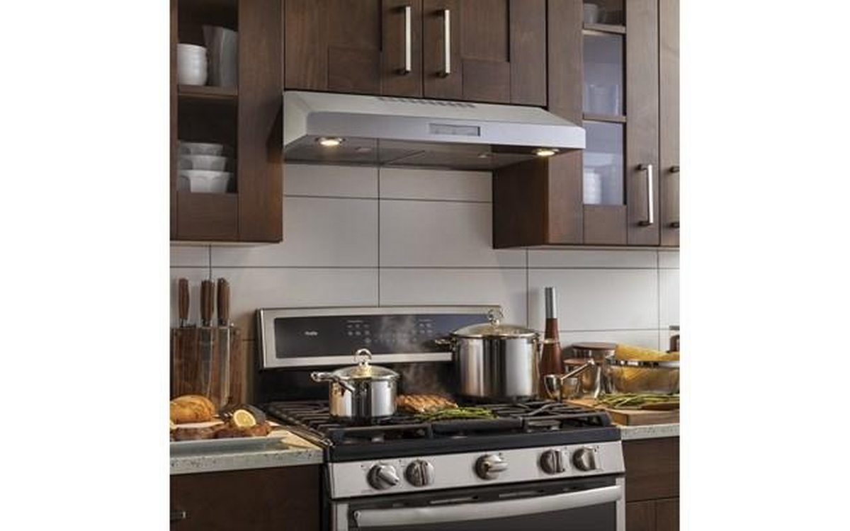 GE Profile Series 30" under cabinet range hood features 4 speeds, 390 CFM, dual LED lighting and dishwasher-safe filter.