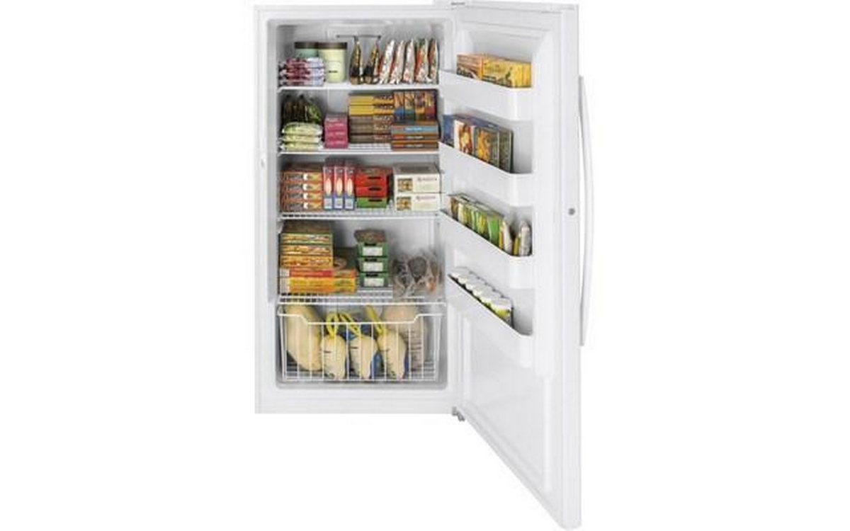 This GE 21.3 cu. ft. upright freezer features Turbo Freeze, LED interior lighting, exterior electronic temperature controls and an audible temperature alarm.