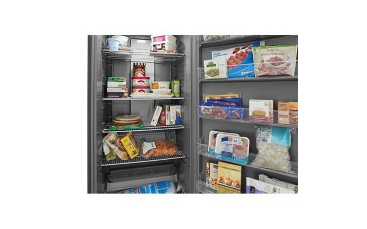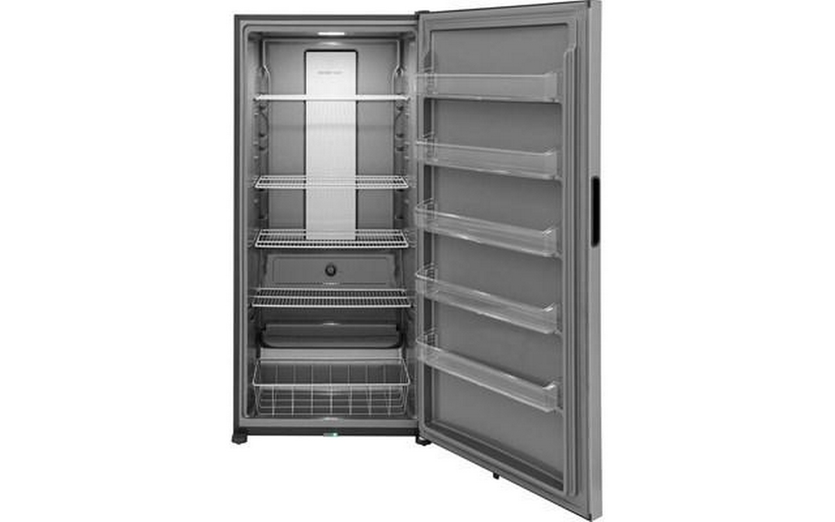 Frigidaire 20 cu.ft. upright freezer with LED lighting. It features automatic defrost, 4 adjustable wire shelves, and 5 fixed white door bins.