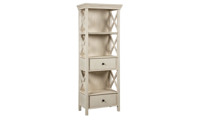 Need a stylish space to showcase dinnerware, pictures, decorations and more? This tall three-shelf display cabinet is a dream come true. The textured antiqued white finish provides a perfect backdrop for presentation. For the items you want to hide, there are two deep drawers. Embellished with the casual appeal of lattice sides, attractive crown moulding, clean lines and lightly distressed finish, this cottage-style shelf provides ample storage in such an artful way.