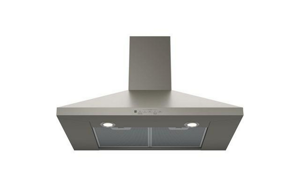 GE® 30" wall-mount pyramid chimney hood featuring electronic backlit controls, a dual halogen cooktop light and dishwasher safe filter.