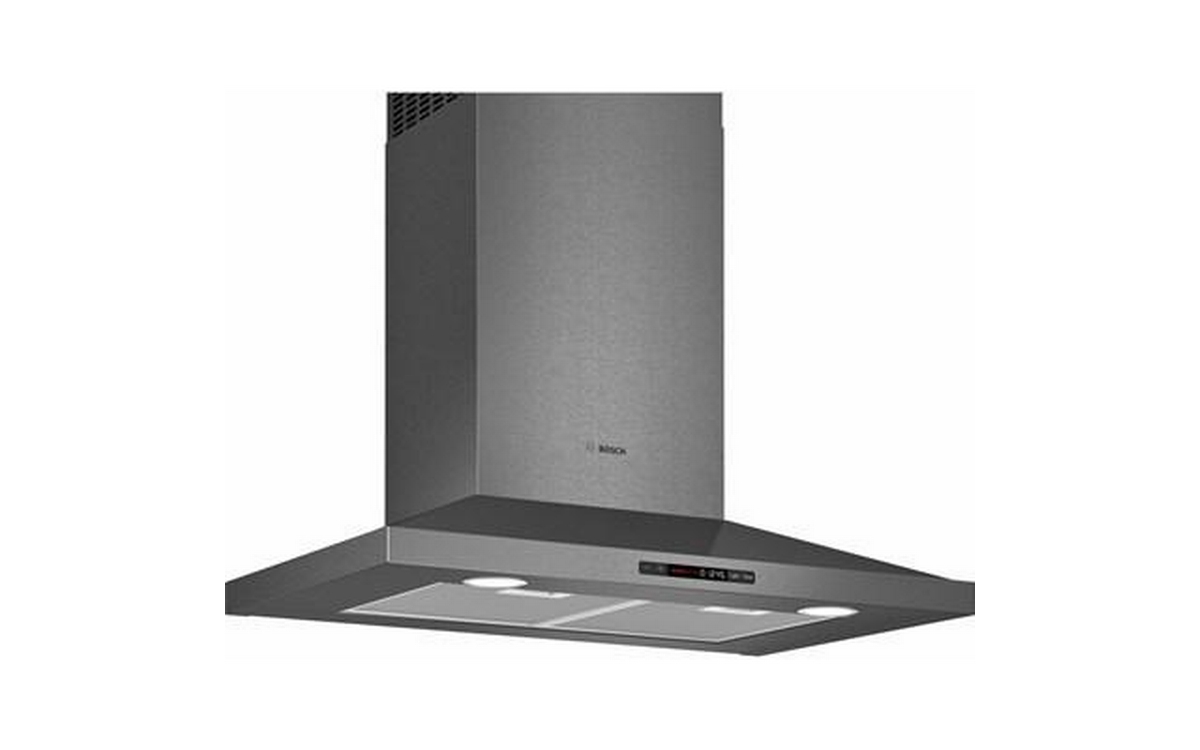 This Bosch 800 Series, 30-inch pyramid canopy chimney hood features a 600 CFM, 4-stage speed settings and LCD touch controls.