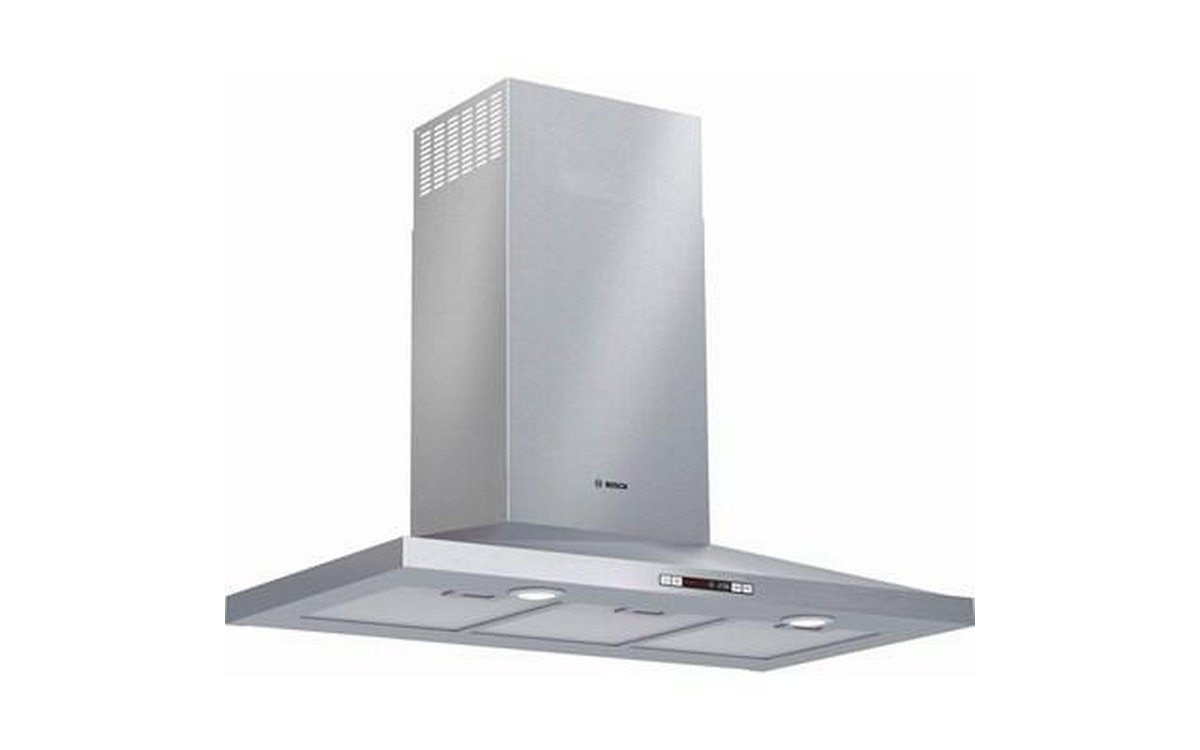 This Bosch 300 Series 36" pyramid canopy chimney ventilation hood features 3-speed power level options, LCD touch display controls and dishwasher safe mesh filters.