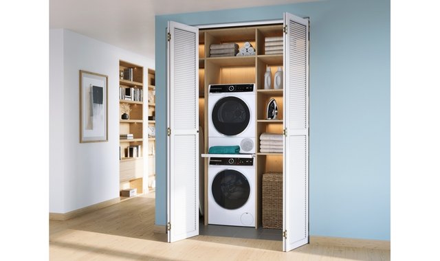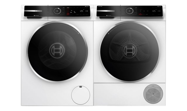 This compact Bosch laundry set includes a 2.4 cu ft front-load washer and a 4.0 cu ft ventless heat pump dryer, perfect for small spaces with stackable installation and Wi-Fi connectivity. The washer features 4D Wash, SuperQuick 15/30 with SpeedPerfect, ActiveWater Plus technology, a stainless steel drum, and Home Connect Wi-Fi for remote operation. The dryer uses AutoDry™ sensors, the Sensitive Drying System, a self-cleaning condenser, QuickDry Auto cycle, and Wrinkle Block to deliver energy-efficient, fabric-safe results. Its EcoSilence™ motor ensures quiet performance.