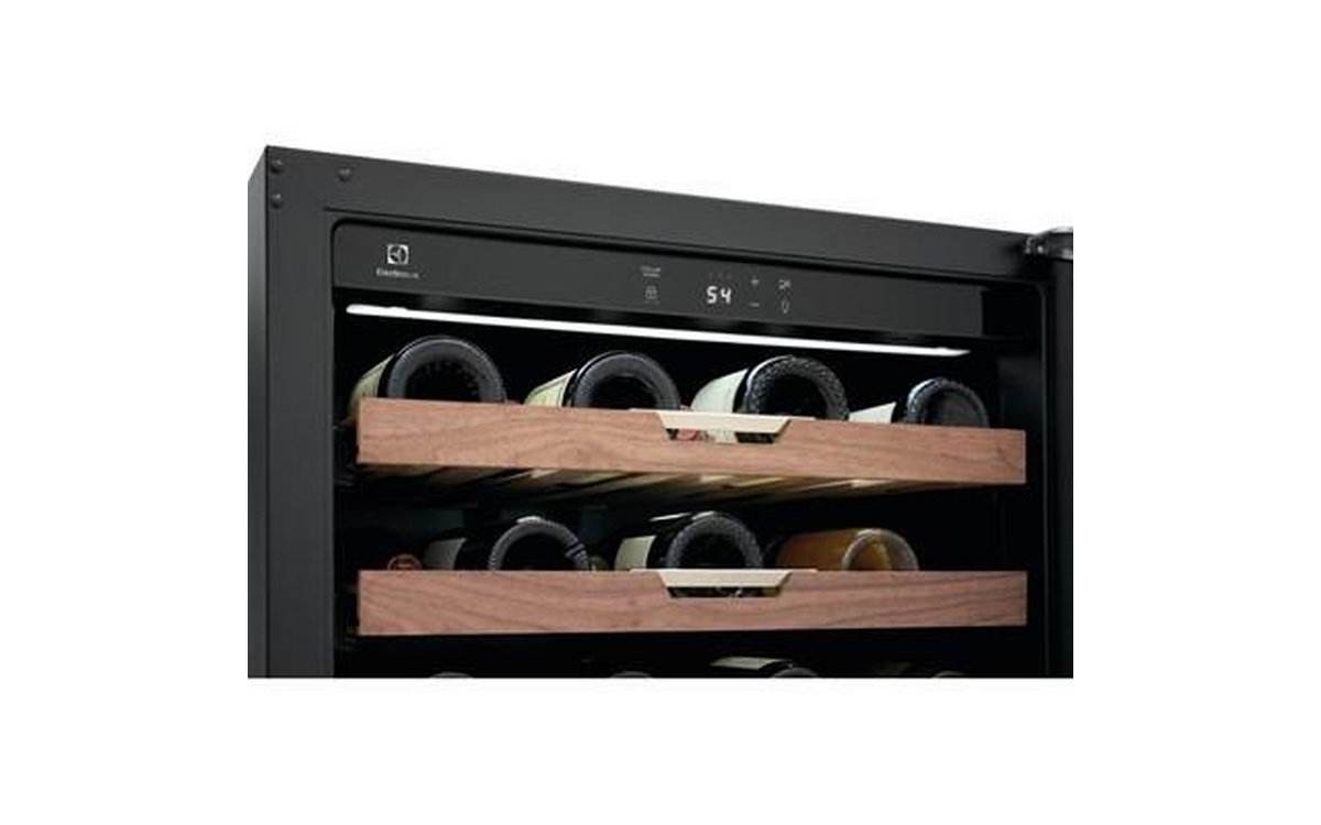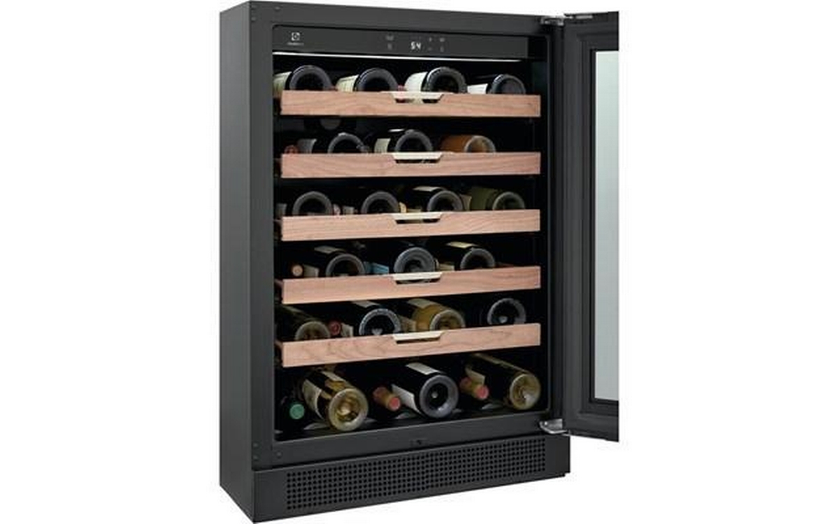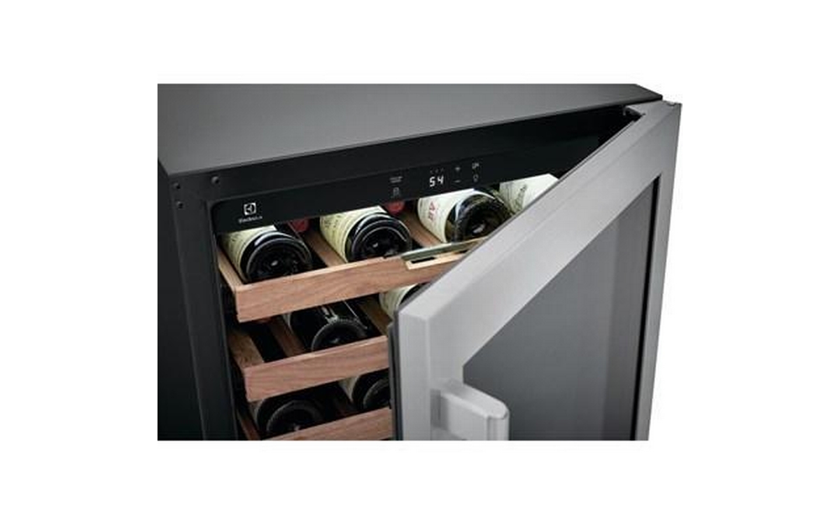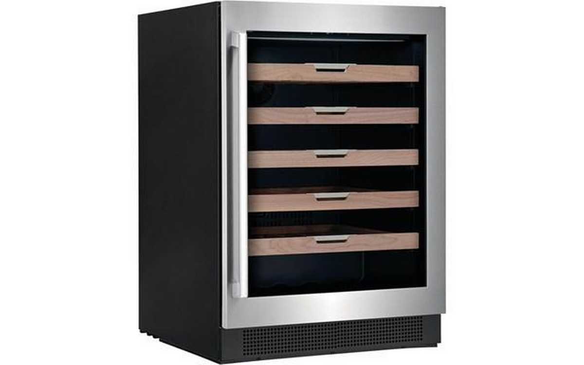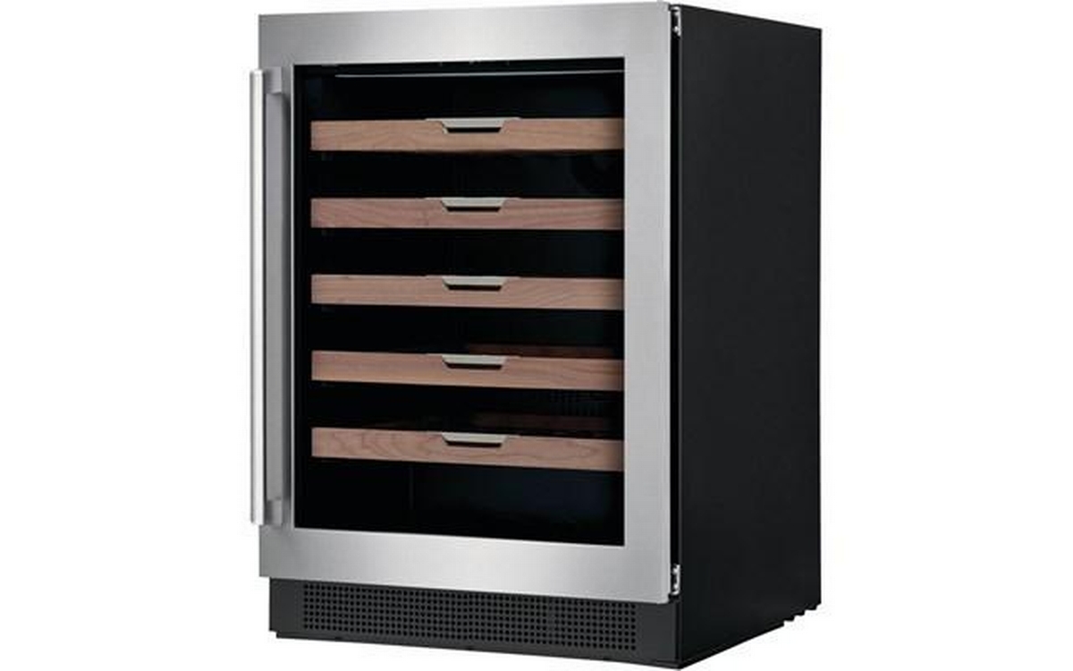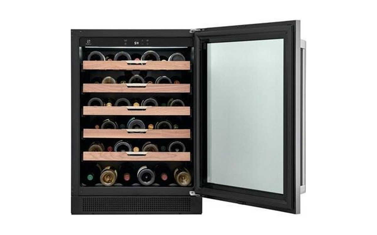 This 24-inch Electrolux under-counter wine cooler features digital display, door ajar alarm, 5 slide-out shelves and can accommodate up to 41 bottles of wine.