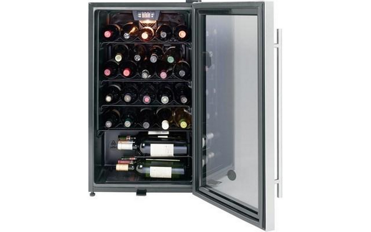 This GE wine cooler features auto defrost, 6 wine racks, adjustable temperature control and can accommodate up to 30 bottles of wine.