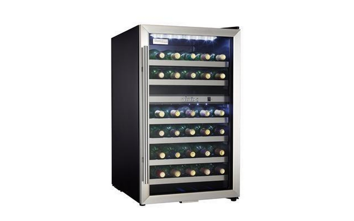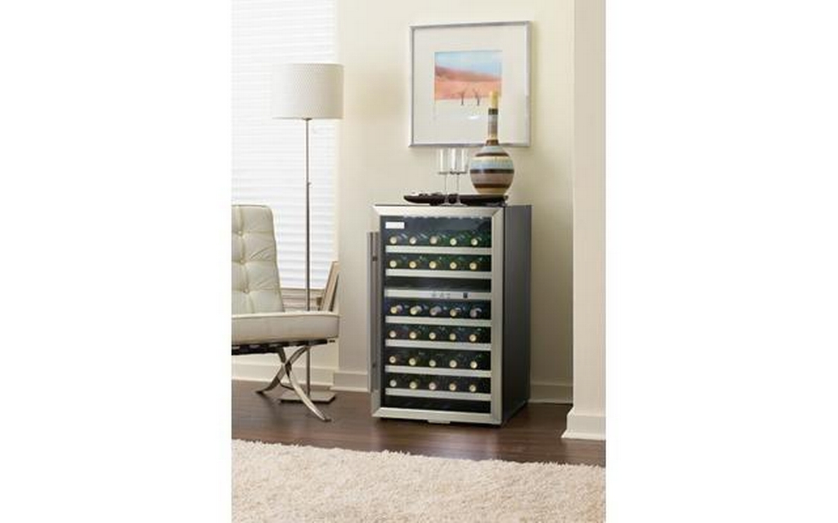 Add a touch of elegance to any room thanks to the all black cabinet with stainless steel trimmed door of this Danby wine cooler. This wine cooler enables you to store up to 38 bottles of wine in two distinct, separately regulated temperature zones for red and white wine storage.